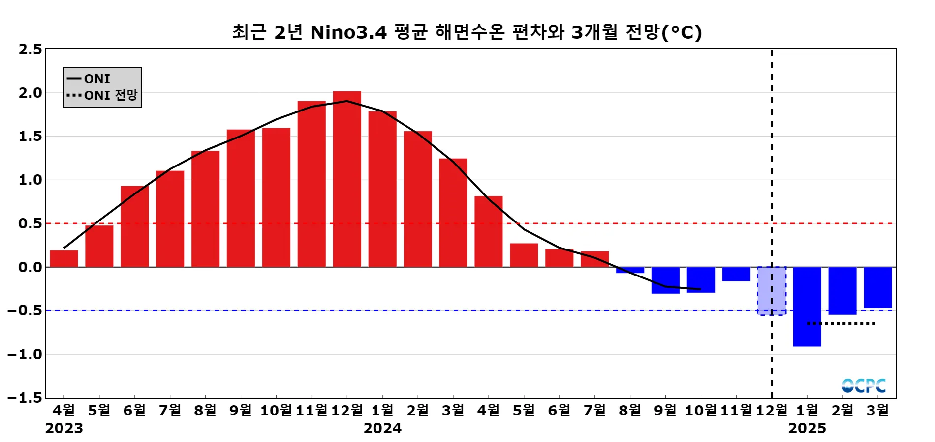 엘니뇨/라니냐 지수(ONI, Ocean Nino Index): 엘니뇨/라니냐 감시구역인 Nino3.4 해역의 월평균 해면수온 편차(채색부분)를 3개월 이동평균하여 나타낸 지수(검정색 실선)로 0.5보다 크면 엘니뇨, -0.5보다 작으면 라니냐로 판정합니다. 과거 지수(최근 2년)는 OISSTv2.1, 전망은 CFSv2 자료에서 산출하였으며, 검정색 점선은 3개월 전망의 평균값을 나타내고 투명도가 있는 막대 그래프는 1일부터 20까지의 평균값(OISSTv2.1)을 의미합니다.