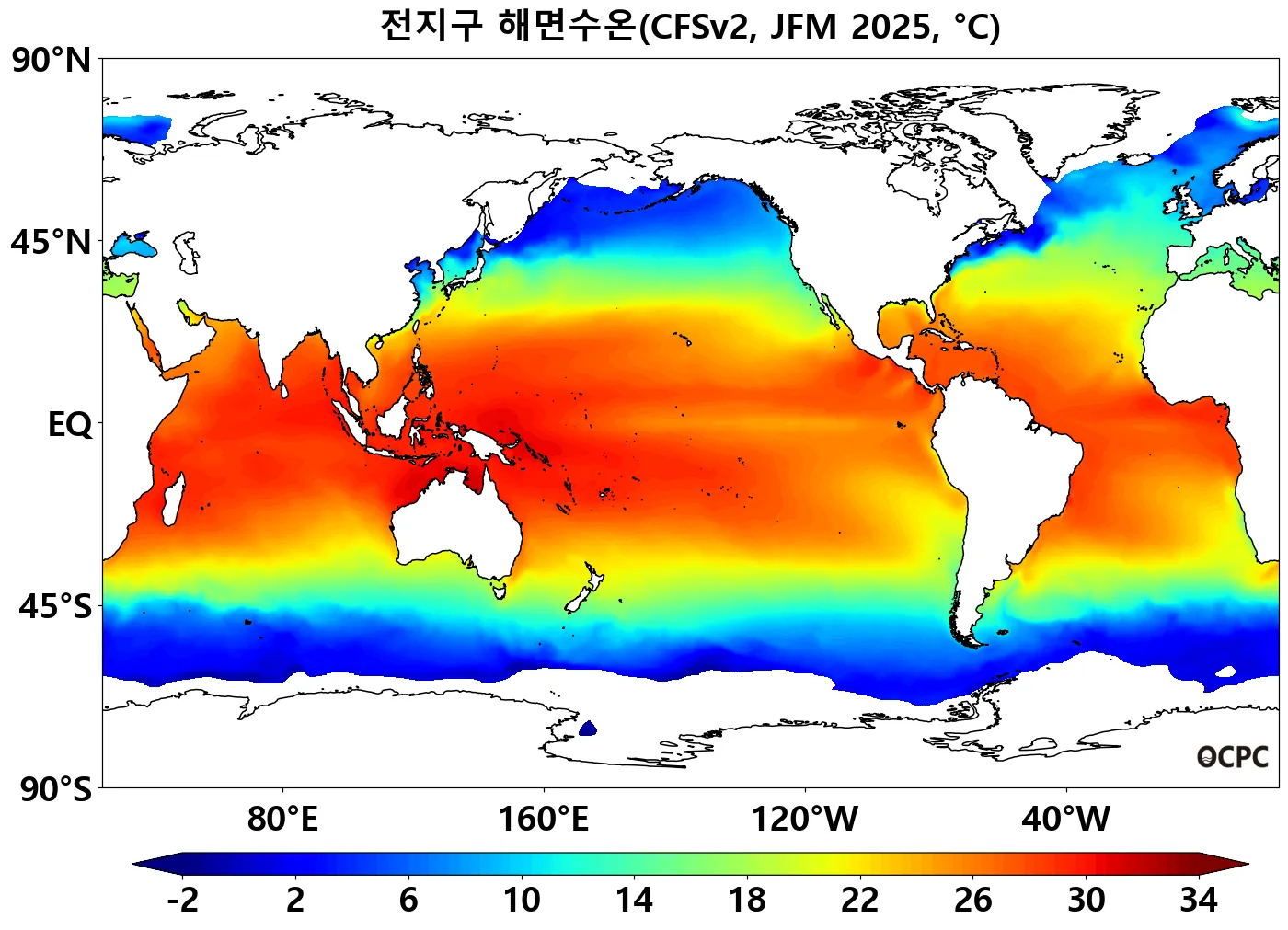 전지구 1~3월 평균 해상기온은 평년(16.7±0.1℃)보다 높겠으며, 북극해, 열대 서태평양, 북태평양, 인도양, 대서양을 중심으로 평년보다 높은 기온이 전망됩니다.