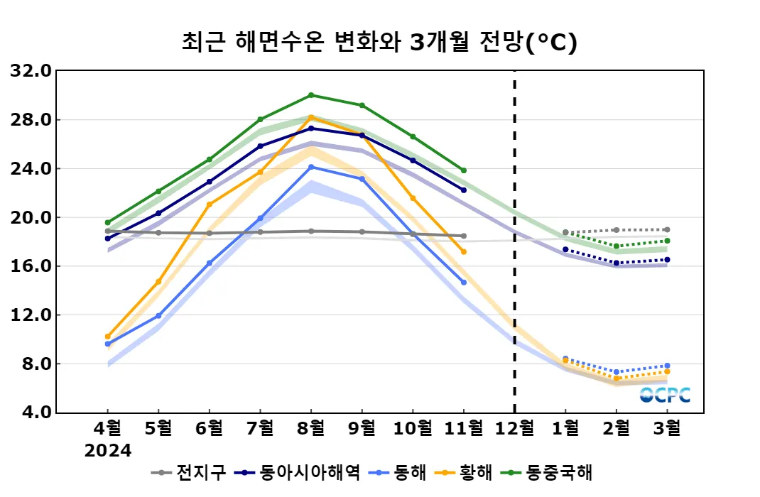 동아시아해역의 1~3월 평균 해상기온은 평년(12.1±0.3℃)보다 높겠습니다.