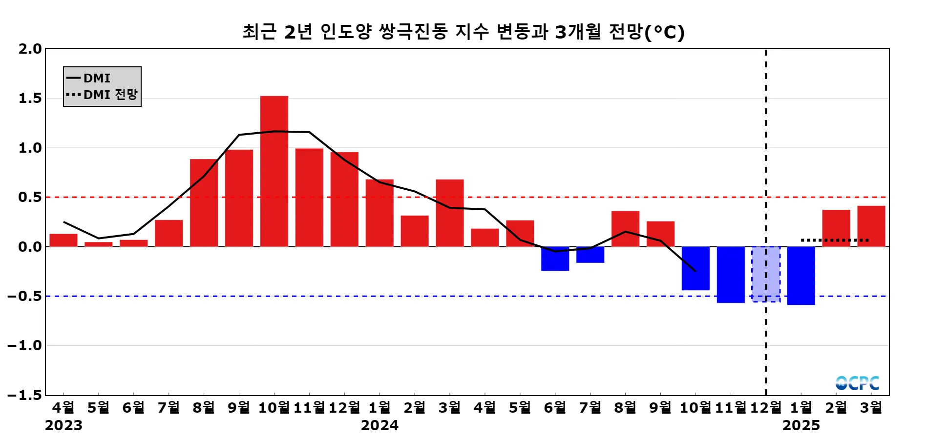 인도양 쌍극진동 지수 DMI (Dipole Mode Index)는 WTIO 해역의 평년 대비 편차에서 SETIO 해역의 평년 대비 편차를 뺀 값으로 월평균 해면수온 편차(채색부분)를 3개월 이동평균하여 나타낸 지수(검정색 실선)로 0.5보다 크면 양의 상태, -0.5보다 작으면 음의 상태로 판정합니다. 과거 지수(최근 2년)는 OISSTv2.1, 전망은 CFSv2 자료에서 산출하였으며, 검정색 점선은 3개월 전망값의 평균값을 나타내고 투명도가 있는 막대 그래프는 1일부터 20일까지의 평균값(OISSTv2.1)을 의미합니다.