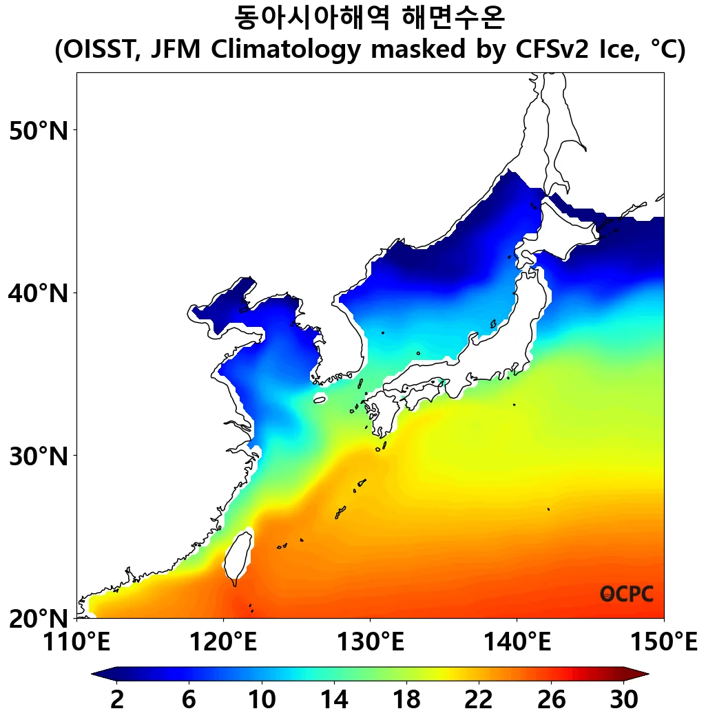 B. 동아시아해역 해면수온(평년 1월~3월 평균), 예상 해빙 해역 제외