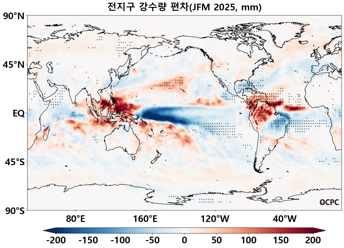 A-B. 전지구 강수량 편차 전망(2025년 1월~3월 평균, 점표시: 평년 ±2 표준편차 초과해역)