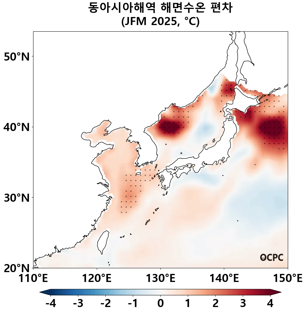 A-B. 동아시아해역 해면수온 편차 전망(2025년 1월~3월 평균, 점표시: 평년 ±2 표준편차 초과해역)