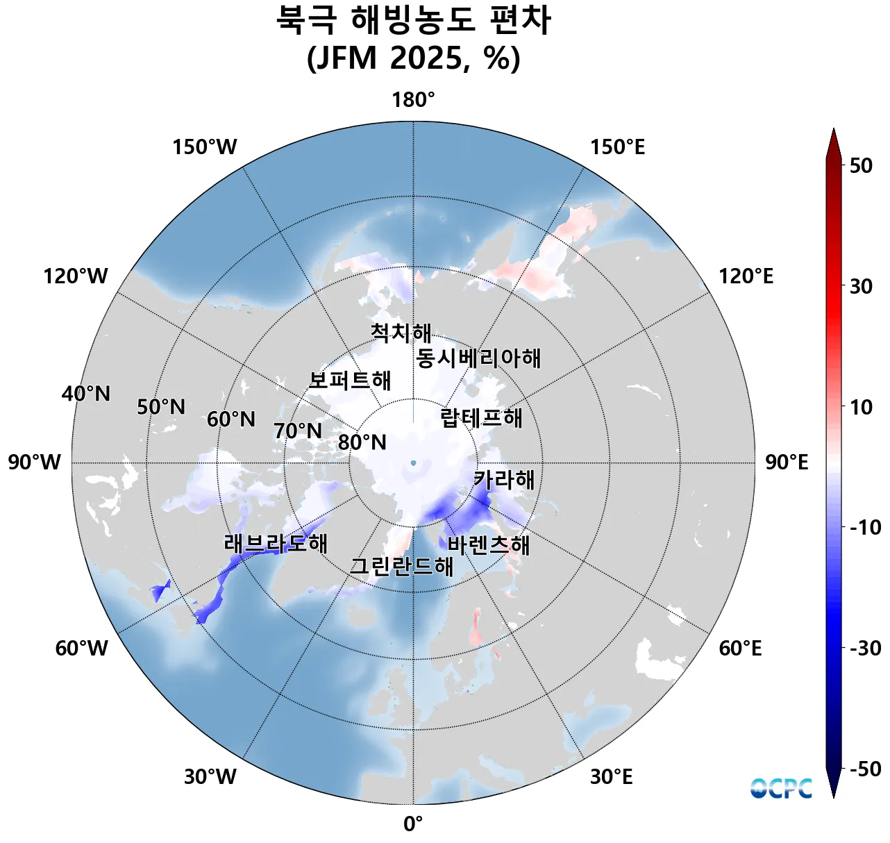 A-B. 북극 해빙농도 편차 전망(2025년 1월~3월 평균, 15% 이상 해역)