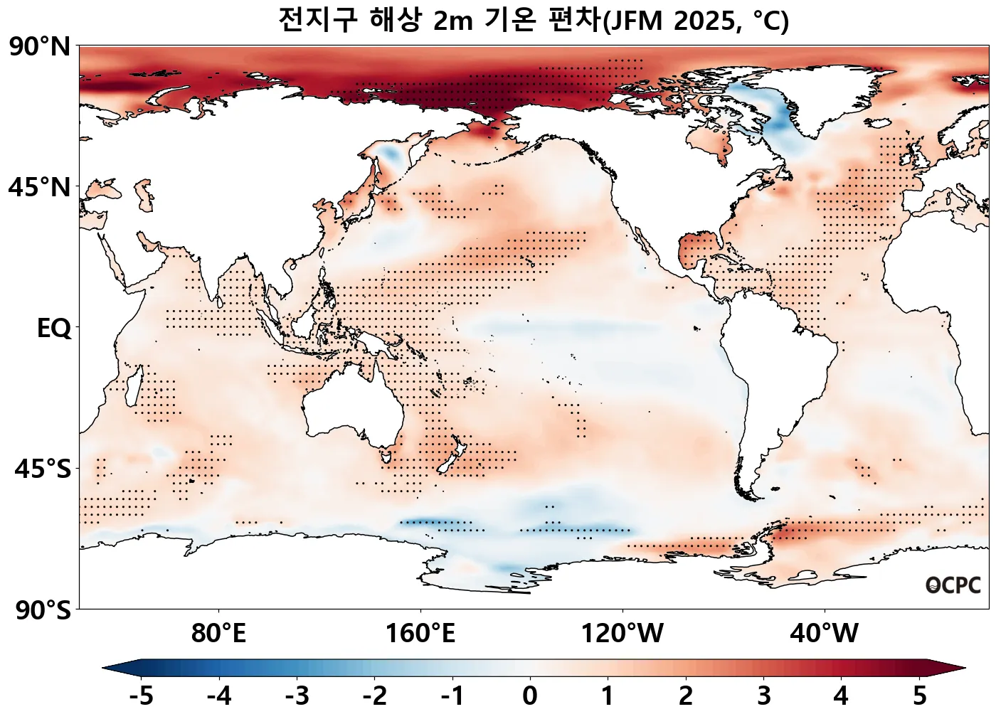 A-B. 전지구 해상기온 편차 전망(2025년 1월~3월 평균, 점표시: 평년 ±2 표준편차 초과해역)