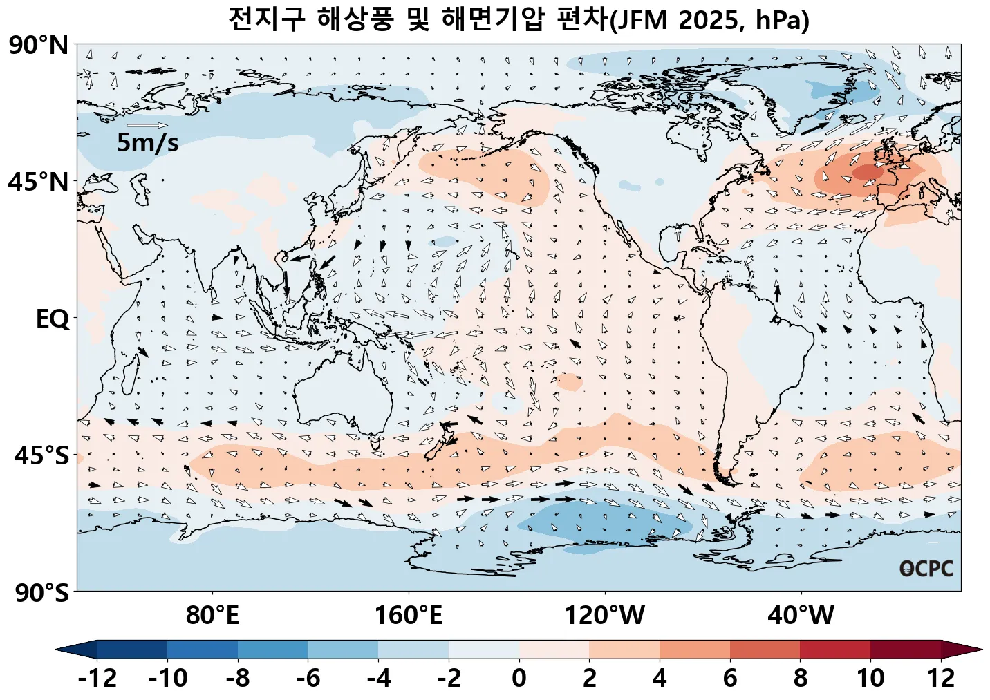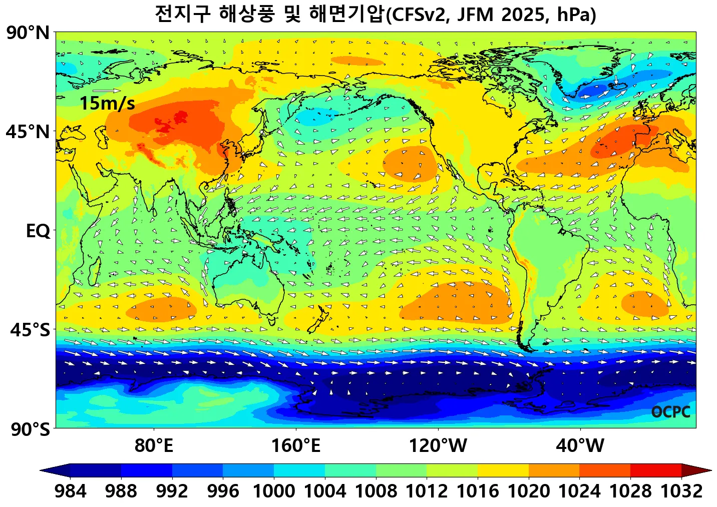 A. 전지구 해상풍 및 해면기압 전망(2025년 1월~3월 평균)