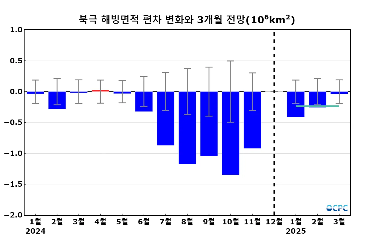 월별 편차 전망에 따르면 해빙이 1월부터 빠르게 증가하여 3월에는 평년수준으로 회복할 것으로 전망하고 있습니다.
