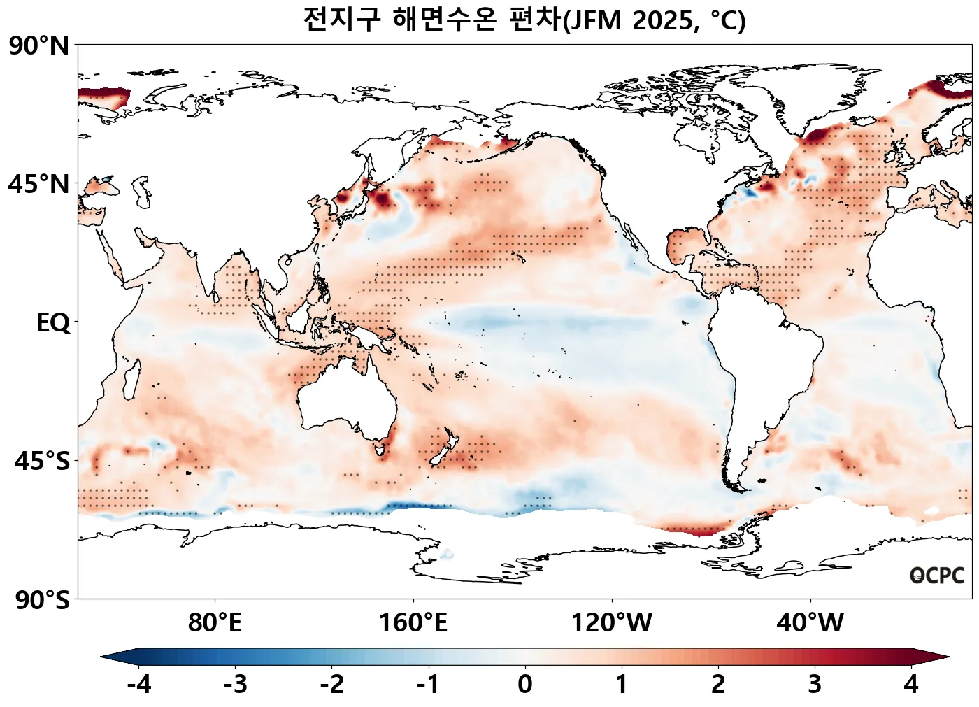 A-B. 전지구 해면수온 편차 전망(2025년 1월~3월 평균, 점표시:  평년 ±2 표준편차 초과해역)