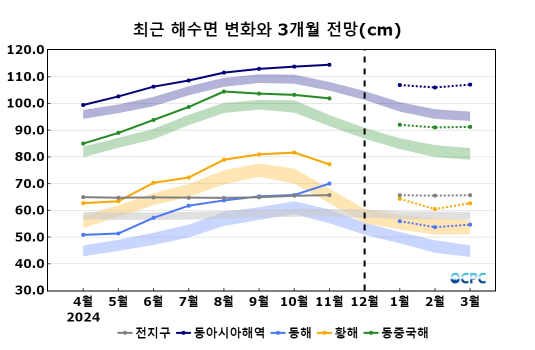 동해, 황해, 동중국해의 1~3월 평균 해수면은 평년(47±2cm, 54±2cm, 82±2cm)보다 높겠습니다.