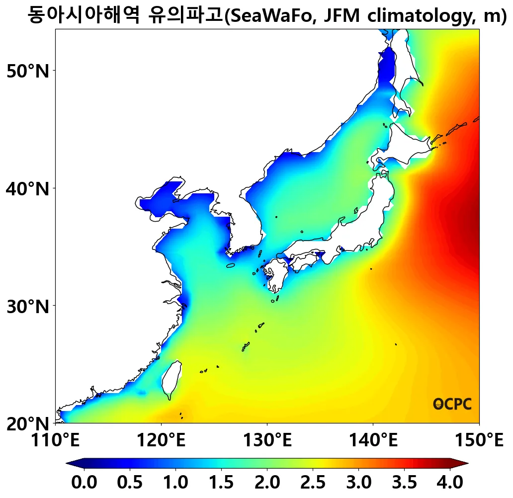 동아시아해역의 1~3월 평균 유의파고는 평년(2.36±0.08m)보다 감소할 것으로 전망됩니다.