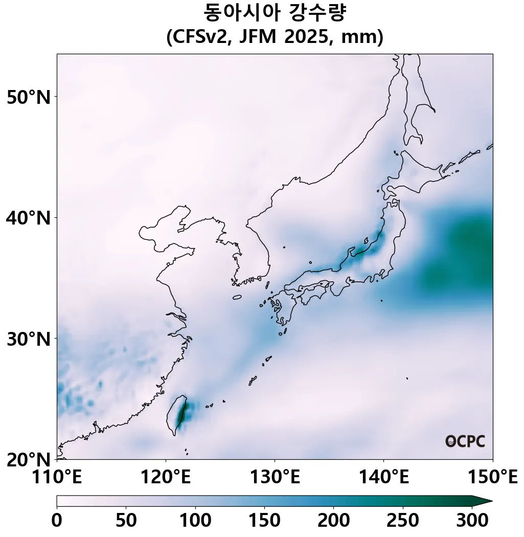A. 동아시아 강수량 전망(2025년 1월~3월 평균)