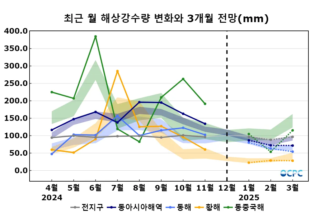 1~3월 동중국해의 평균 해상강수량은 평년(116.3±17.2mm)보다 적겠으며, 동해 및 황해의 평균 해상강수량은 평년(71.2±7.3mm, 32.7±7.7mm)과 비슷하겠습니다.