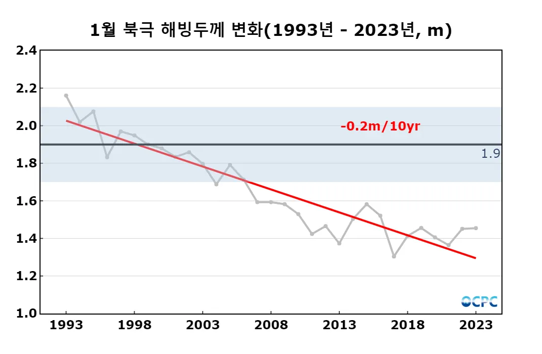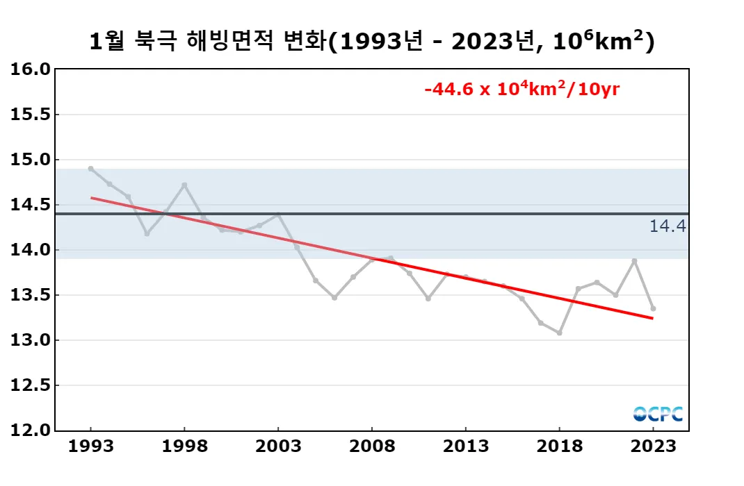 1993~2023년 동안 1월 북극 해빙면적은 10년에 44.6만km²씩 감소하는 추세입니다.