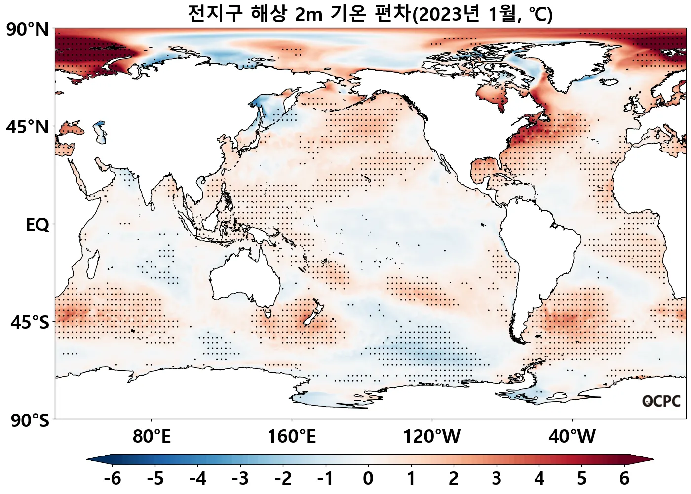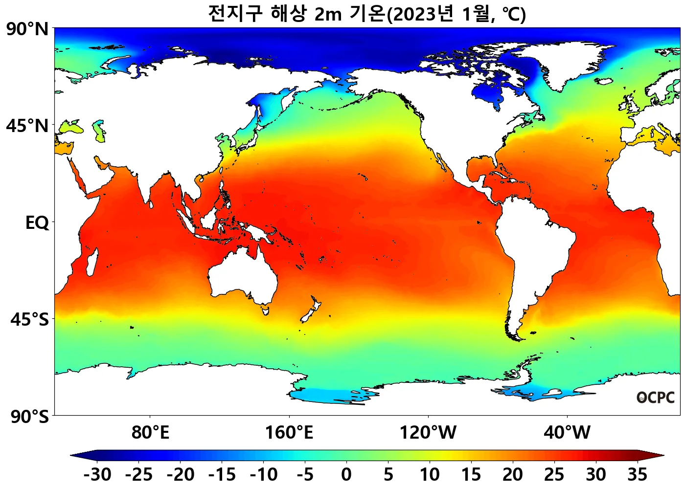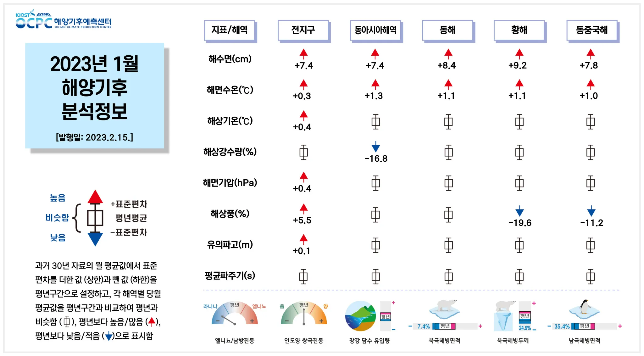 요약 : 전지구 평균 해수면과 동해 해면수온은 역대 1월 중 가장 높았으며, 남극 해빙은 역대 1월 중 최소면적을 기록했습니다.