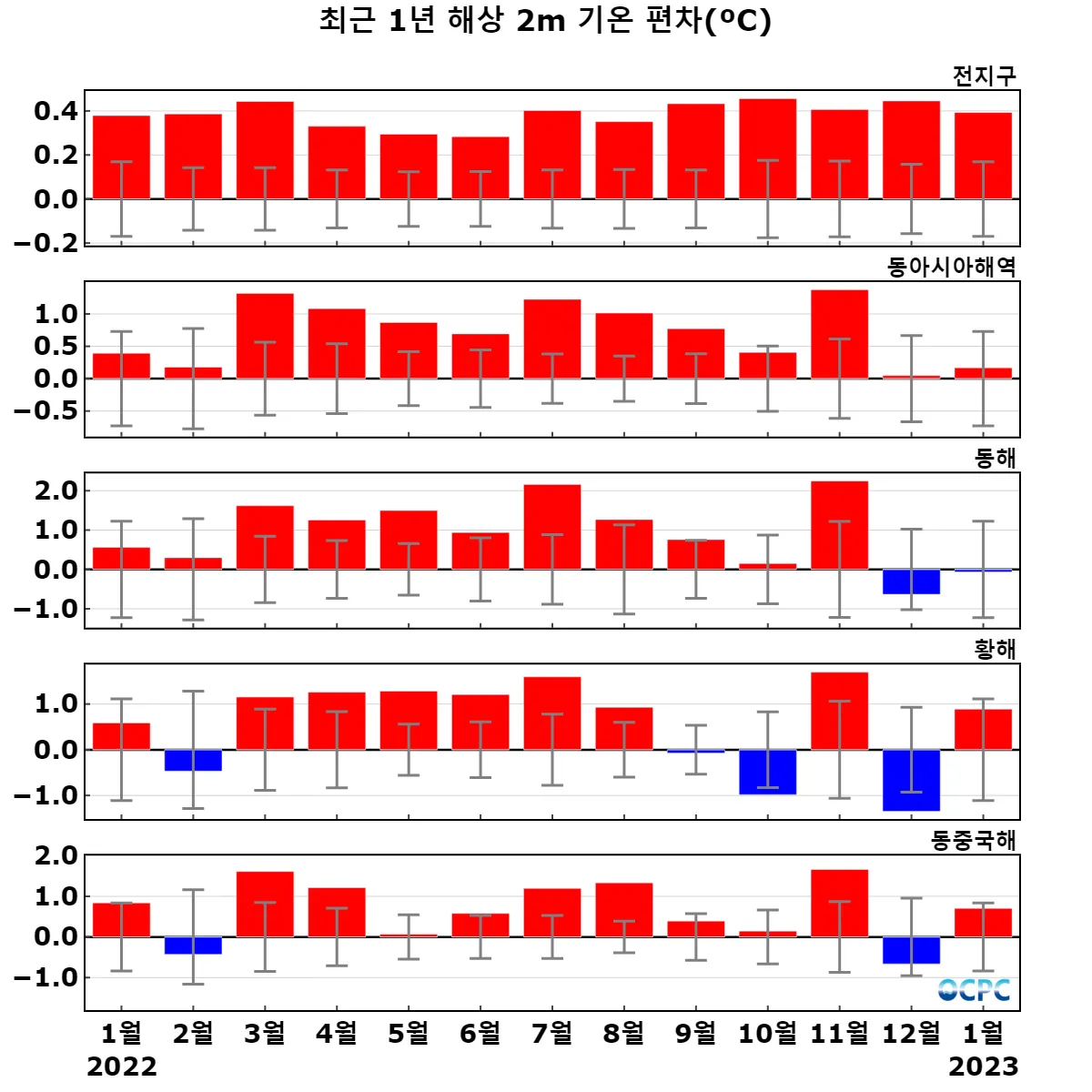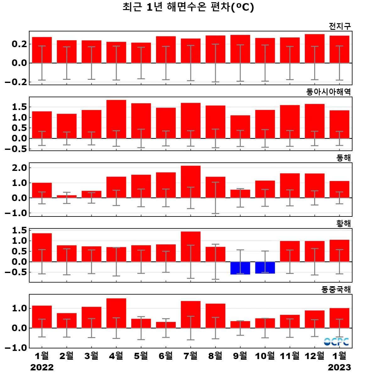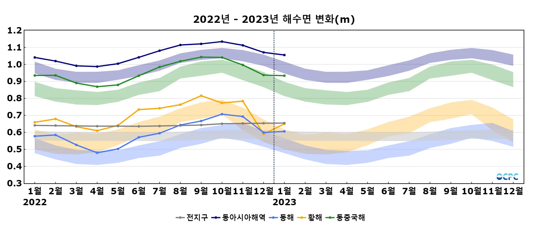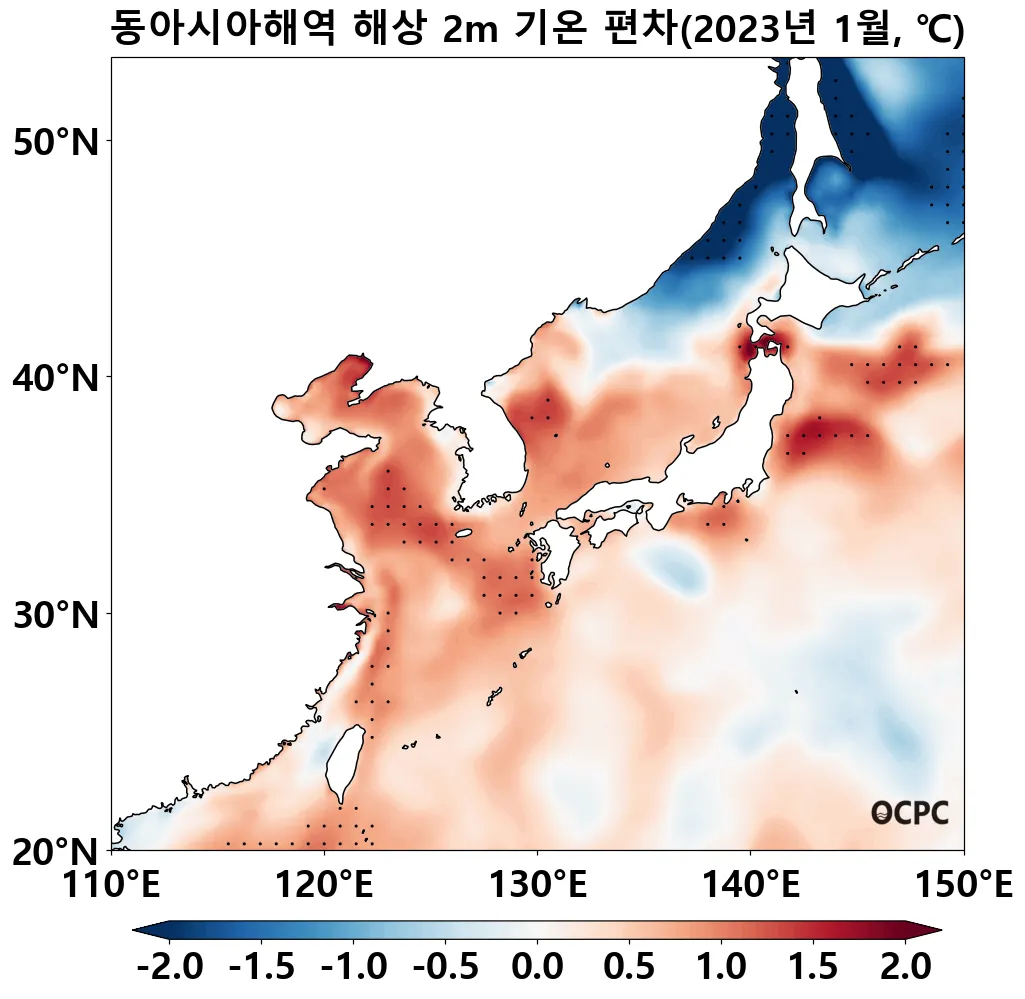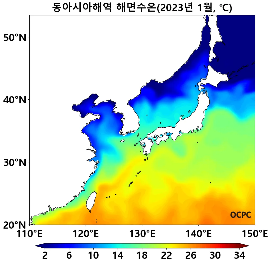 동해는 평년(7.3±0.4°C)보다 1.1°C 높아 1982~2023년(1월) 중 가장 높았으며, 황해는 평년(7.2±0.6°C)보다 1.1°C 높았고, 동중국해는 평년(17.9±0.5°C)보다 1.0°C 높았습니다.