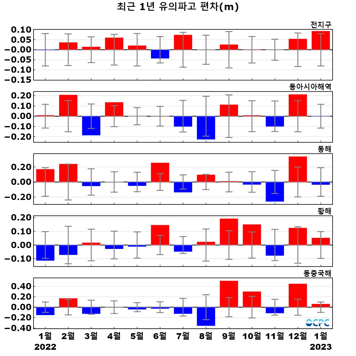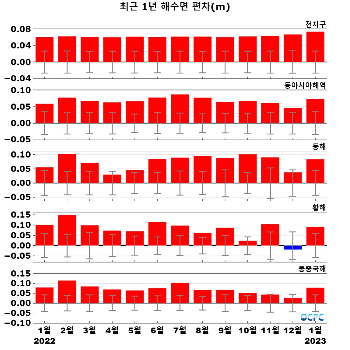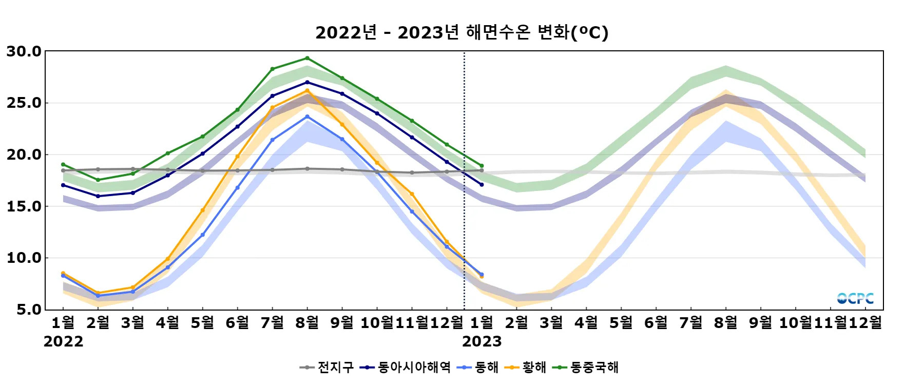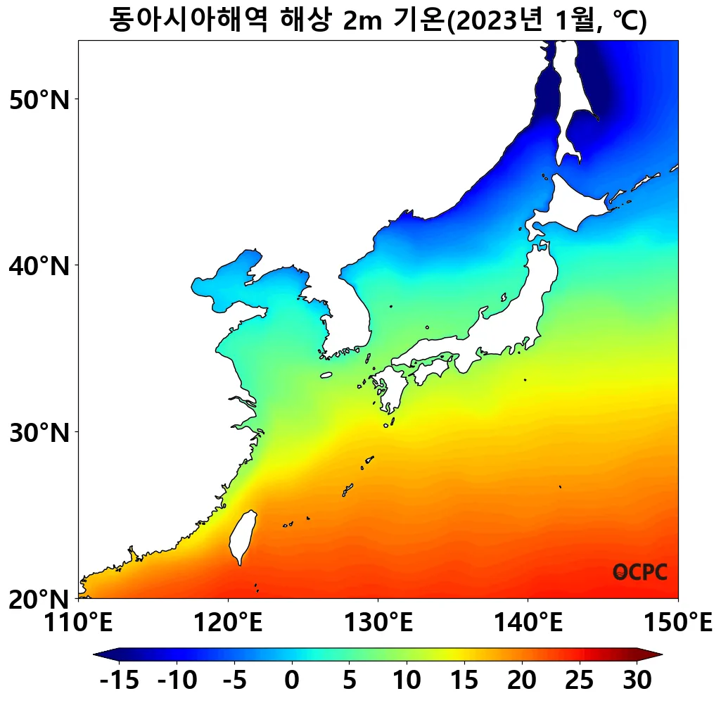 동해는 평년(7.3±0.4°C)보다 1.1°C 높아 1982~2023년(1월) 중 가장 높았으며, 황해는 평년(7.2±0.6°C)보다 1.1°C 높았고, 동중국해는 평년(17.9±0.5°C)보다 1.0°C 높았습니다.