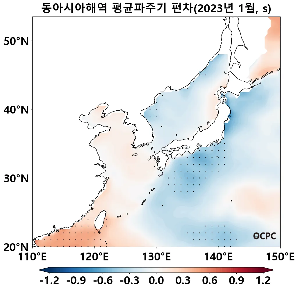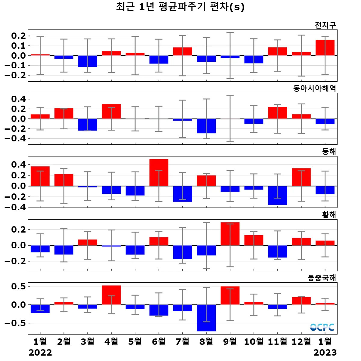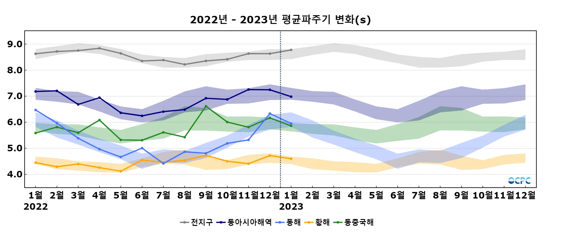 동해, 황해, 동중국해의 평균파주기는 평년(6.1±0.3초, 4.5±0.2초, 5.8±0.2초)과 비슷했습니다.