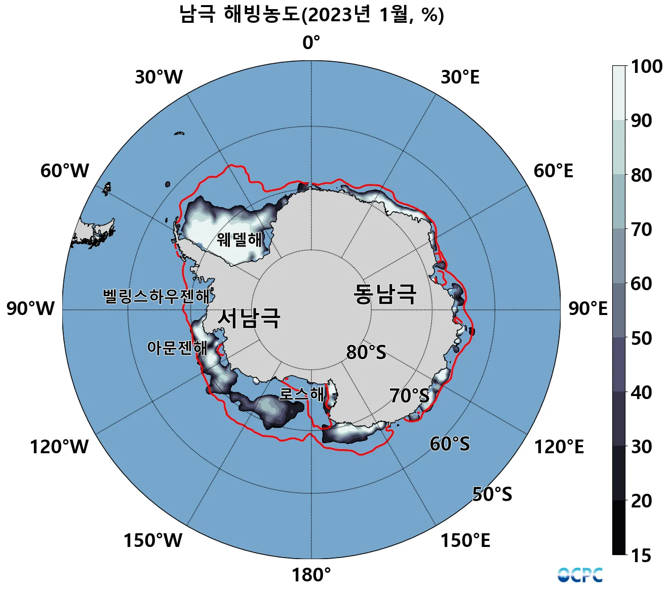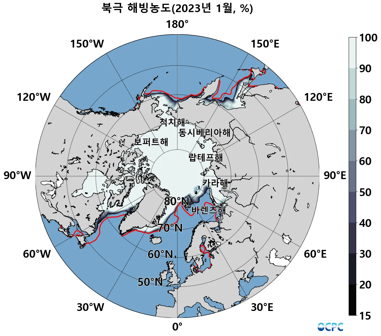 해빙농도 15% 이상 해역, 붉은선(평년 해빙농도 15% 경계)