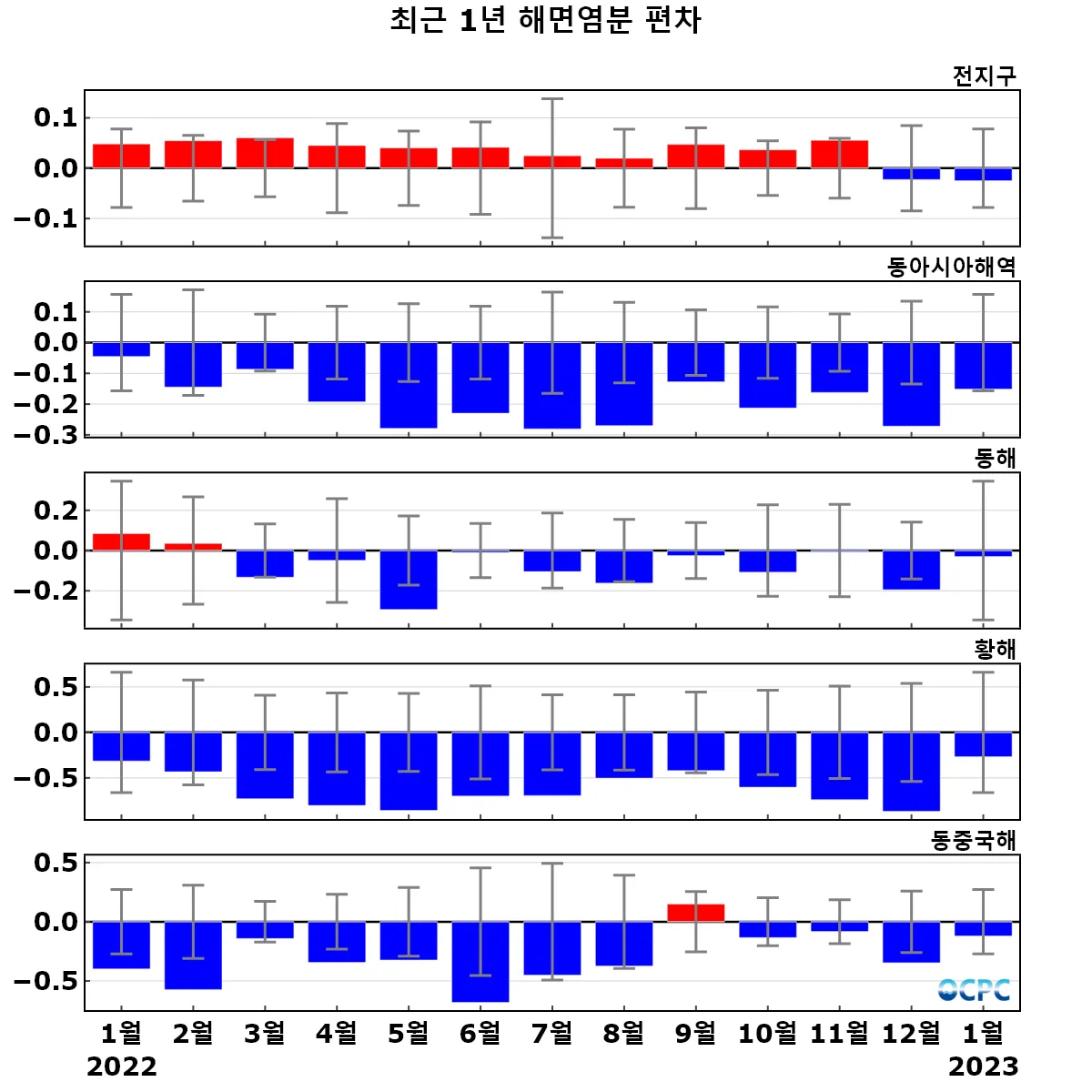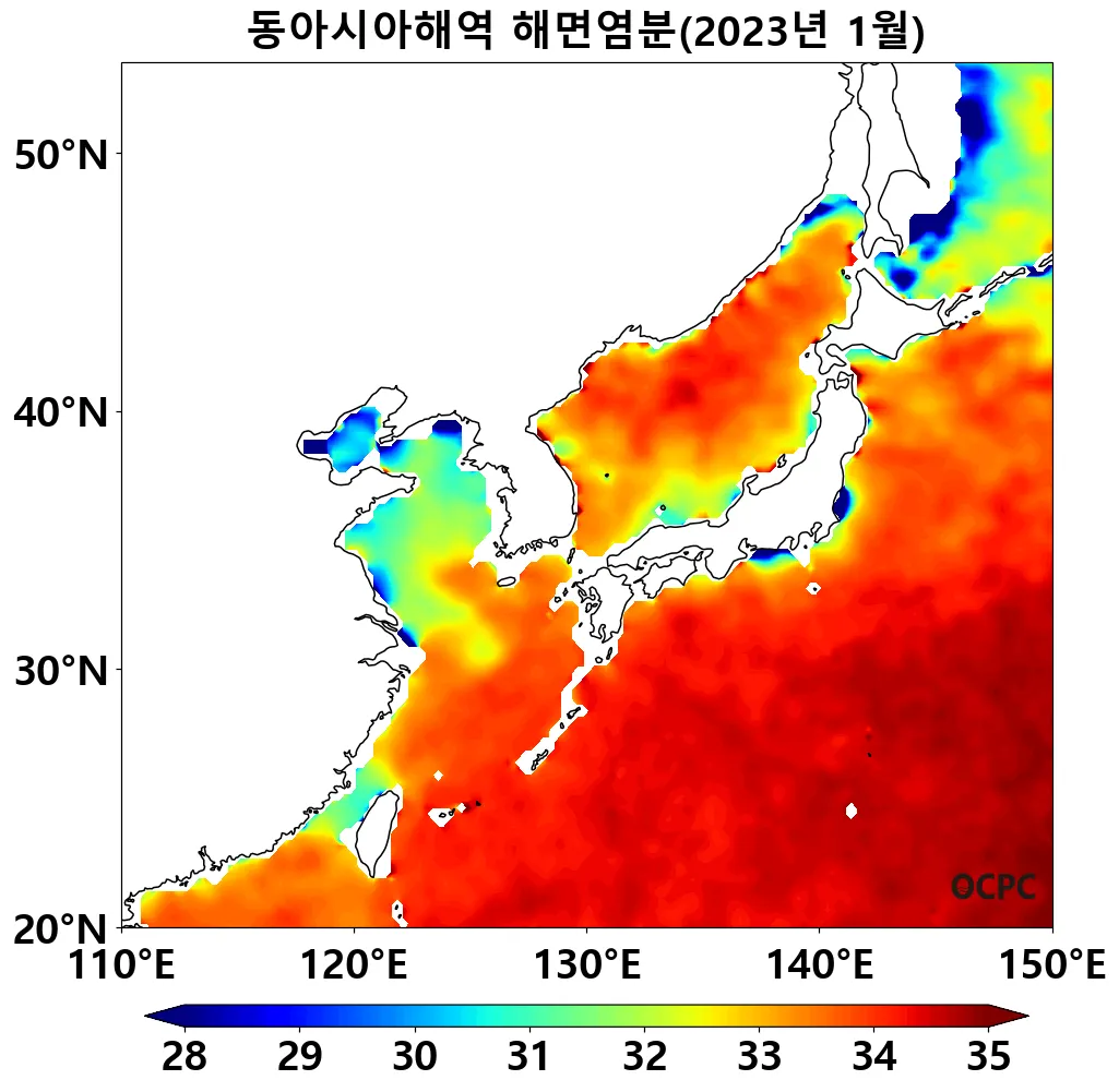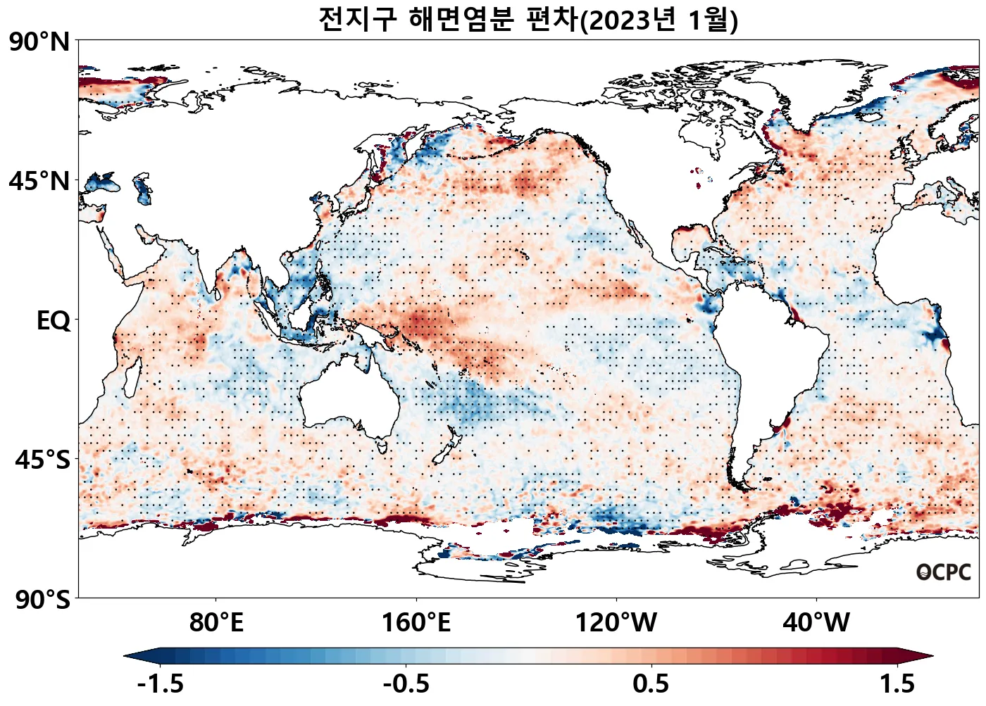 전지구 해면염분은 자료기간(2016.1-2023.1, 8년) 평균(34.80±0.04)과 비슷했습니다.