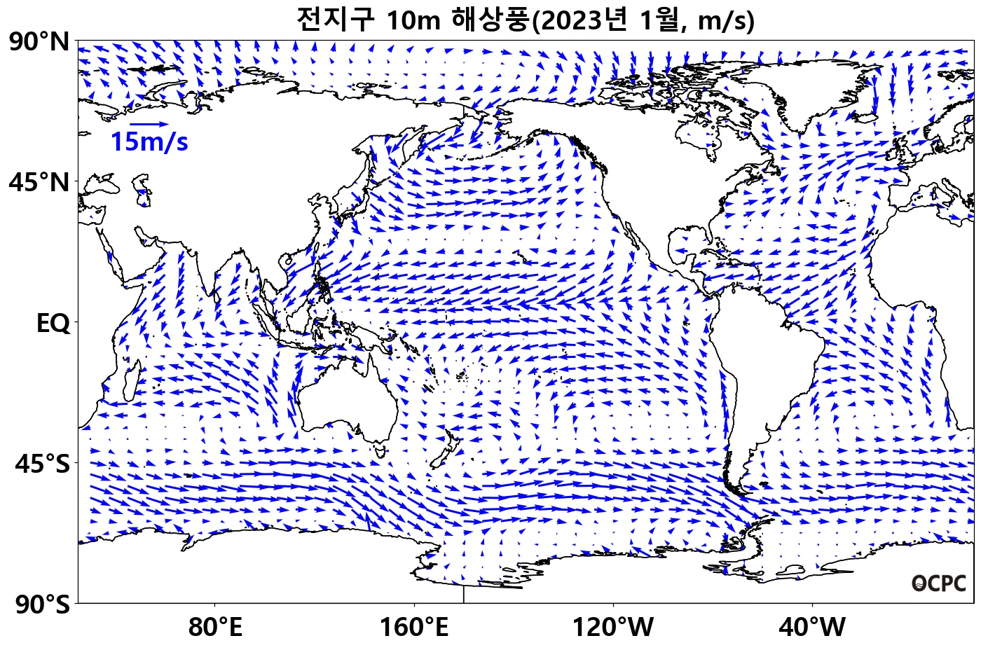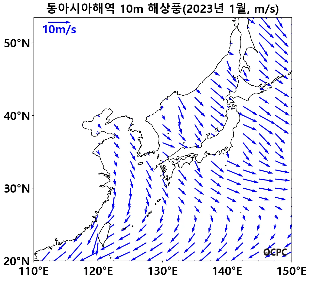 1993~2023년 동안 전지구, 동아시아해역의 1월 해상풍속은 10년에 각각 0.1m/s, 0.2m/s씩 증가하는 추세입니다.