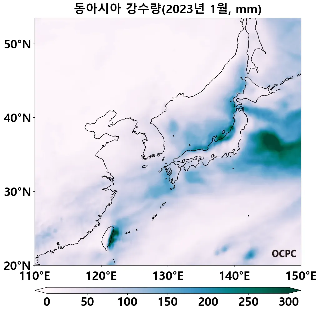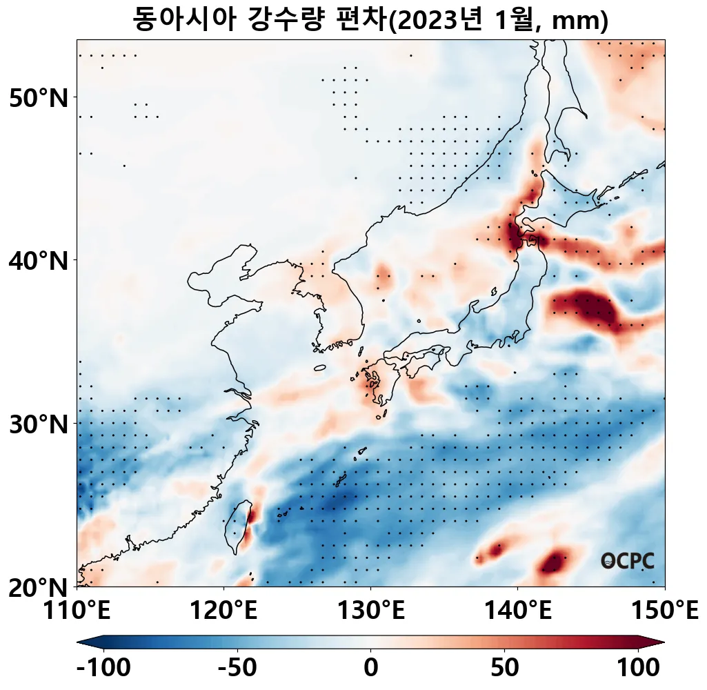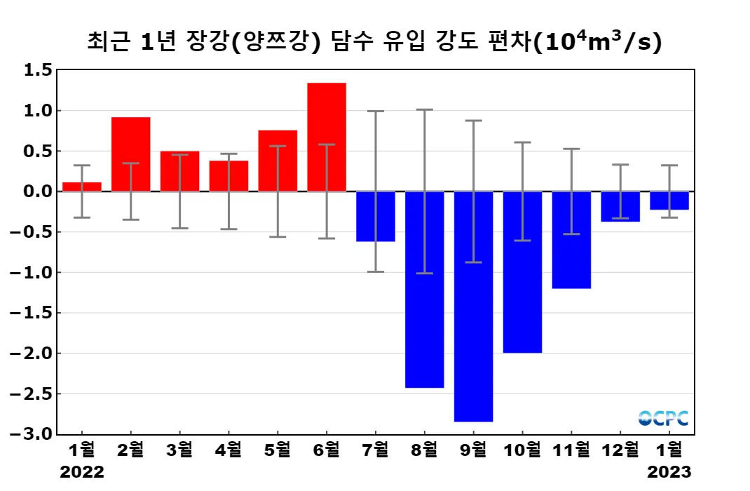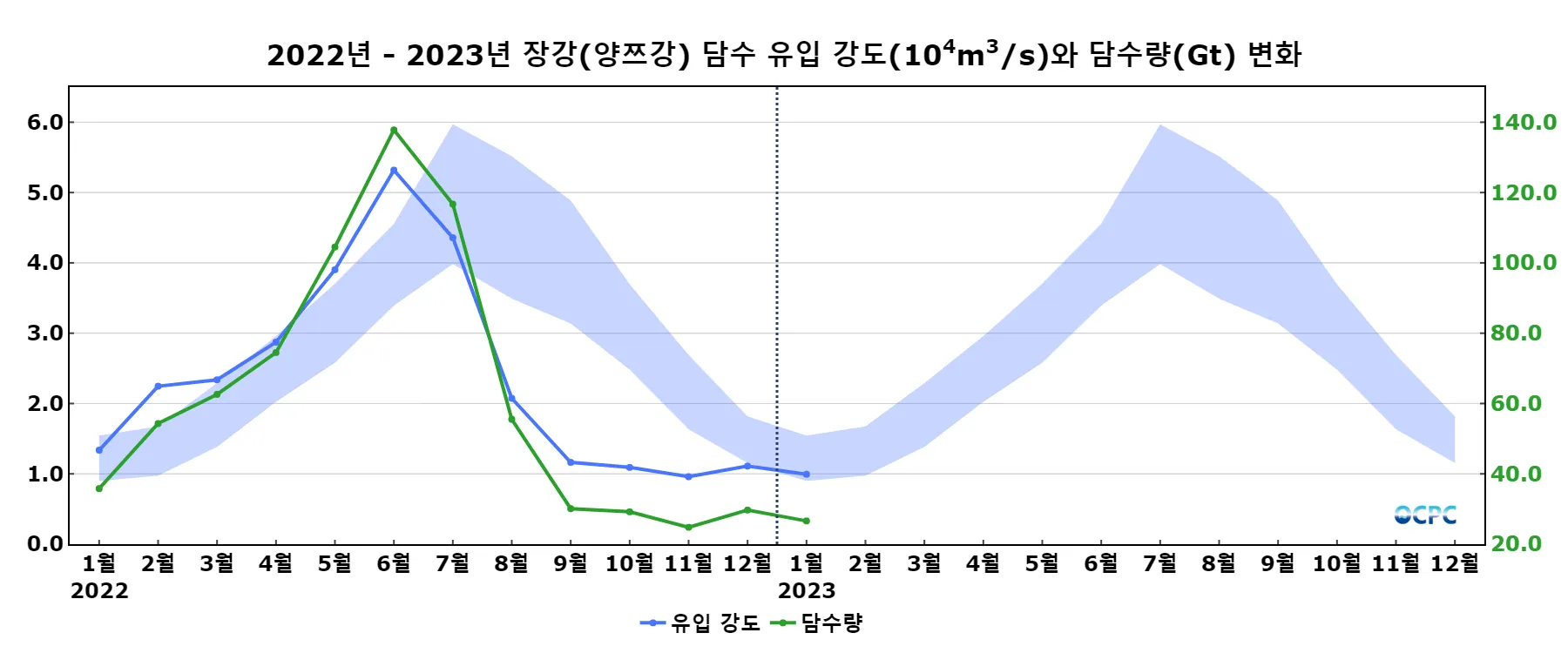 1월 한 달 동안 동중국해로 유입된 담수량으로 환산하면, 26.6기가톤(1Gt=10⁹m³=1km³)으로 평년(32.7±8.7기가톤)과 비슷했습니다.