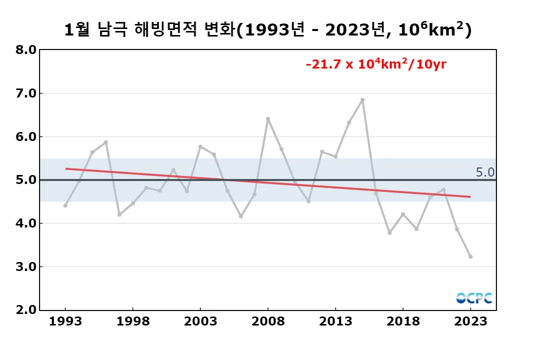 1993~2023년 동안 1월 남극 해빙면적은 10년에 21.7만km²씩 감소하는 추세입니다.