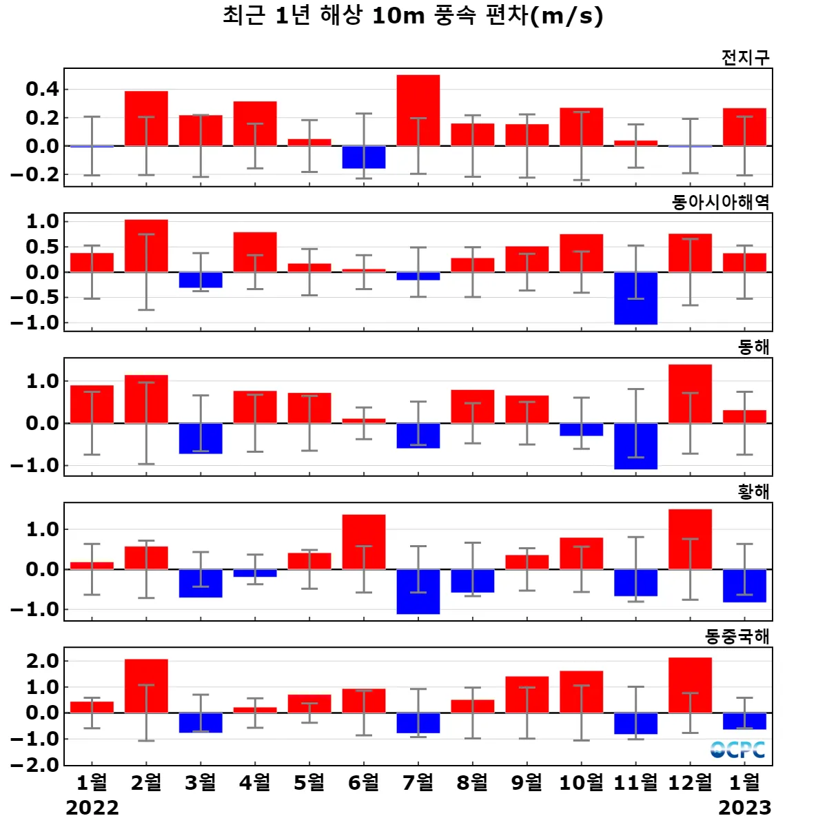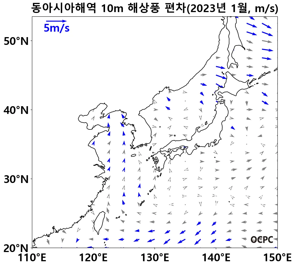 동해의 해상풍속은 평년(5.7±0.7m/s)과 비슷했으며, 황해, 동중국해의 해상풍속은 평년(4.2±0.6m/s, 5.7±0.6m/s)보다 0.8m/s(19.6%), 0.6m/s(11.2%) 약했습니다.