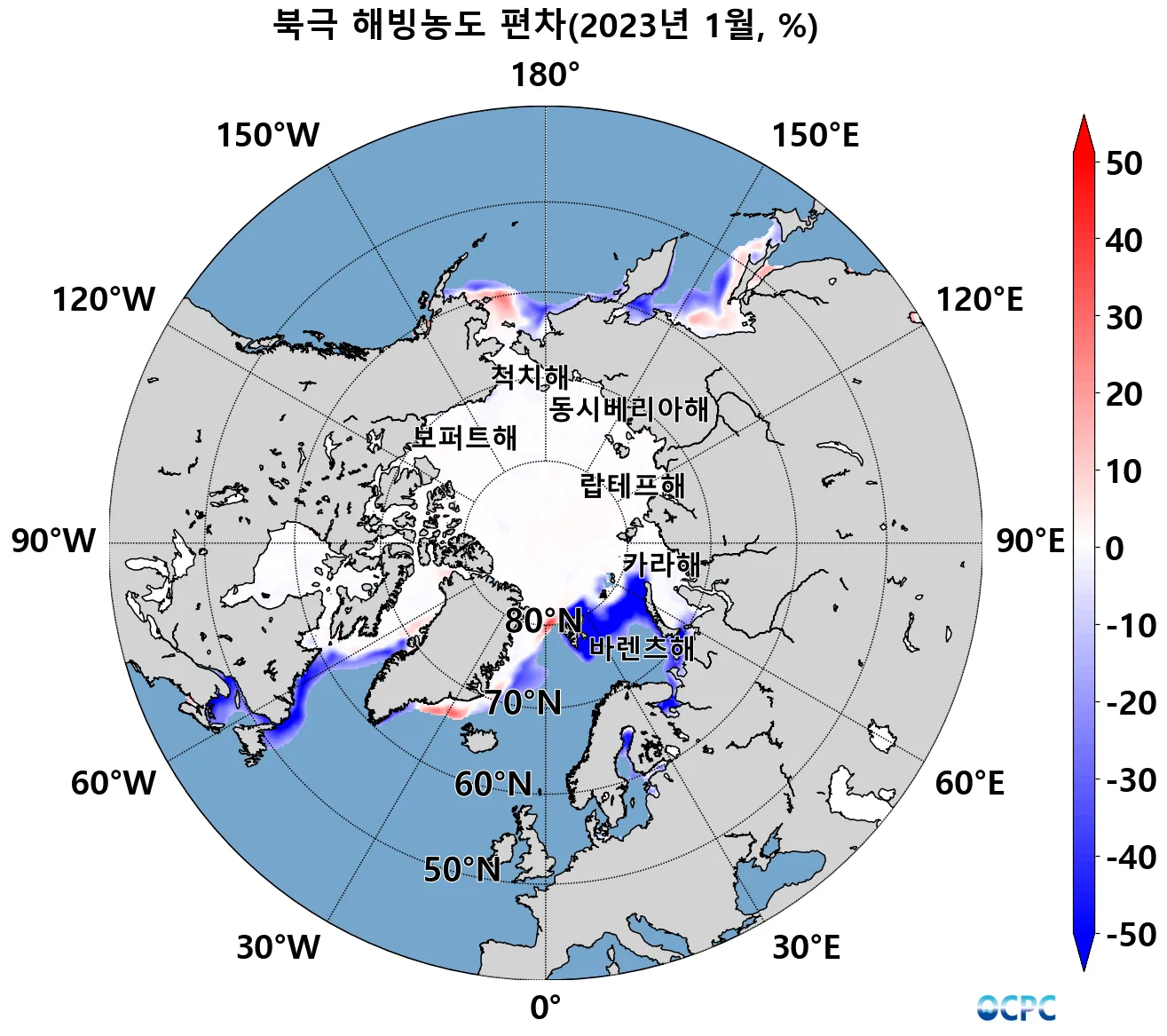 북극 해빙면적은 1,335만km²로 평년(1,442만±46만km²)보다 107만km²(7.4%) 작았고, 역대 1월 최소였던 2018년보다 27만km² 큰 값입니다. 이는 1979~2023년(1월) 중 3번째로 작은 값입니다.