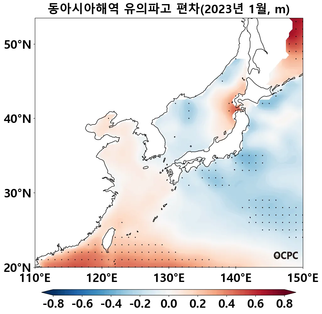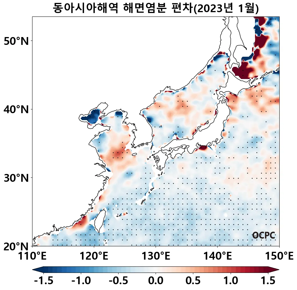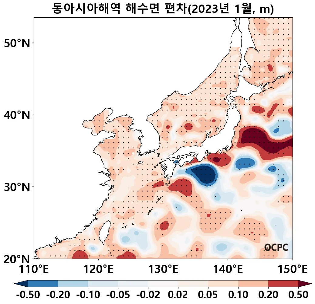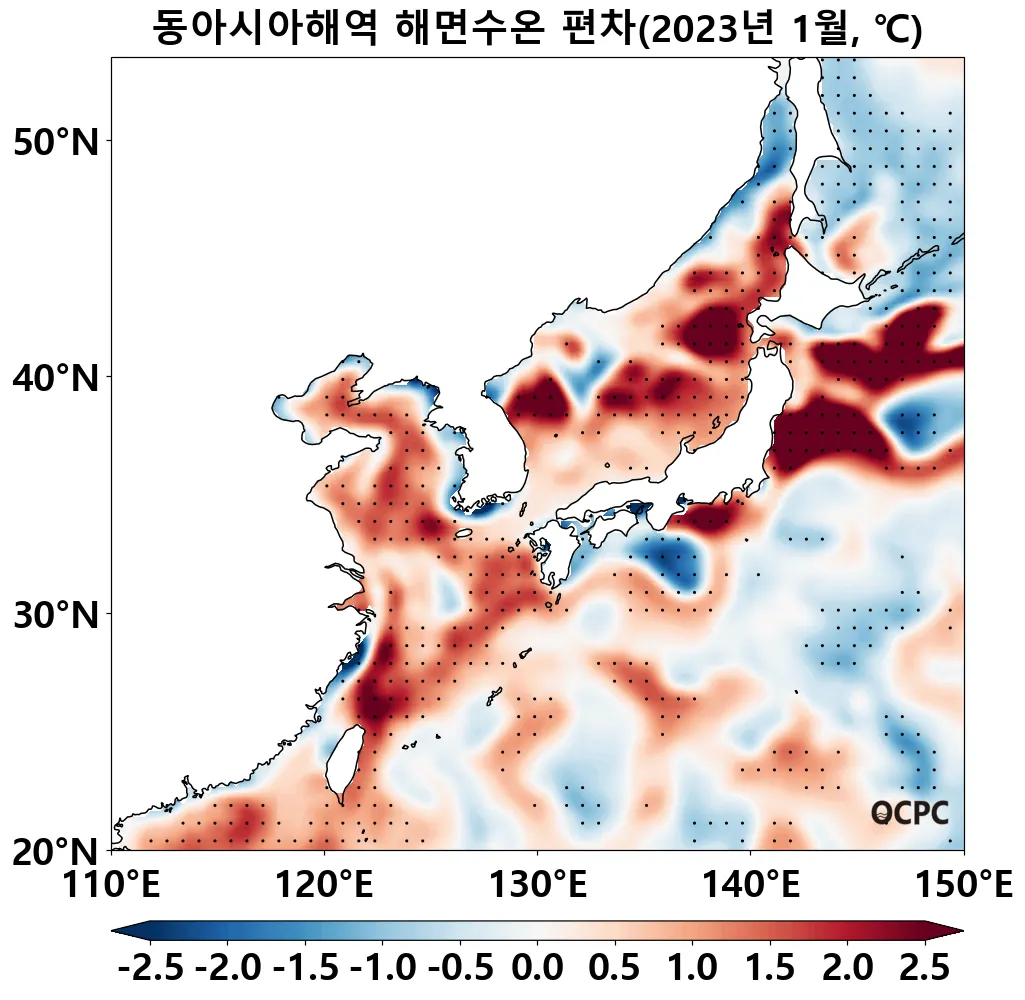 동아시아해역은 평년(15.8±0.3°C)보다 1.3°C 높아 1982~2023년(1월) 중 가장 높았으며, 쿠로시오 해류와 오야시오 해류가 만나는 해역(140°E~150°E, 35°N~45°N)과 동해의 상승이 두드러졌습니다.