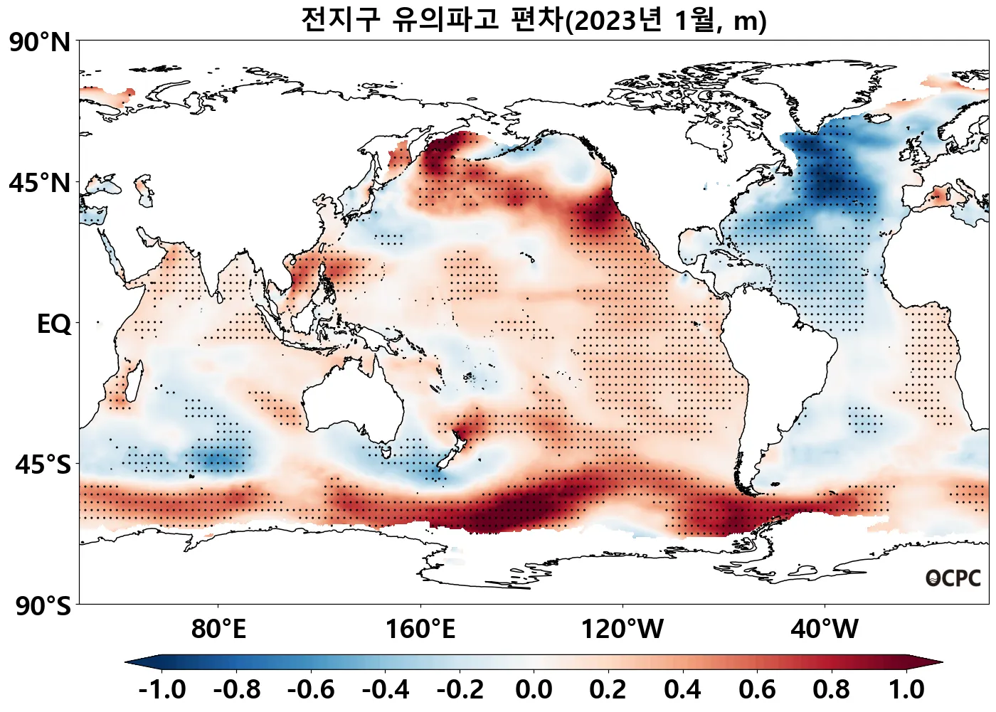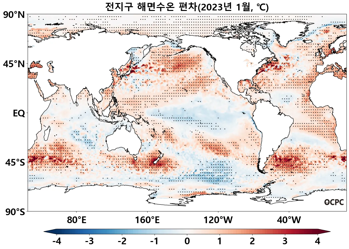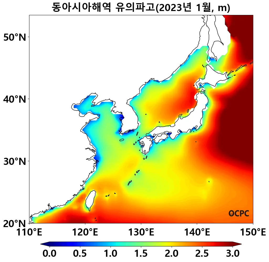 동아시아해역은 평년(15.8±0.3°C)보다 1.3°C 높아 1982~2023년(1월) 중 가장 높았으며, 쿠로시오 해류와 오야시오 해류가 만나는 해역(140°E~150°E, 35°N~45°N)과 동해의 상승이 두드러졌습니다.