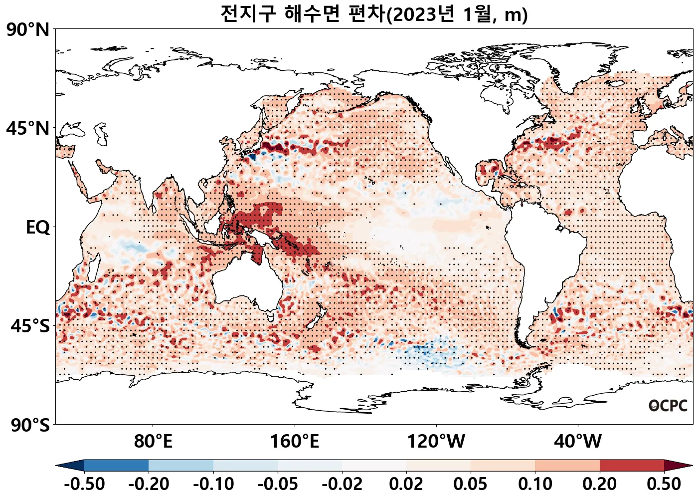 특히 인도-태평양 웜풀해역(열대 서태평양과 인도네시아 주변 해역)의 해수면이 평년보다 두드러지게 높았습니다.