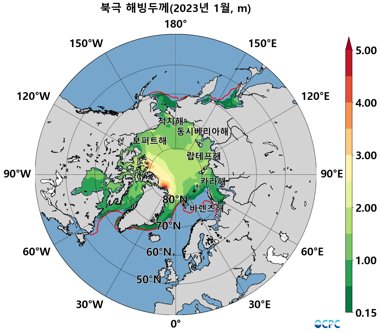 해빙두께 0.15m 이상 해역, 붉은선(평년 해빙두께 0.15m 경계)