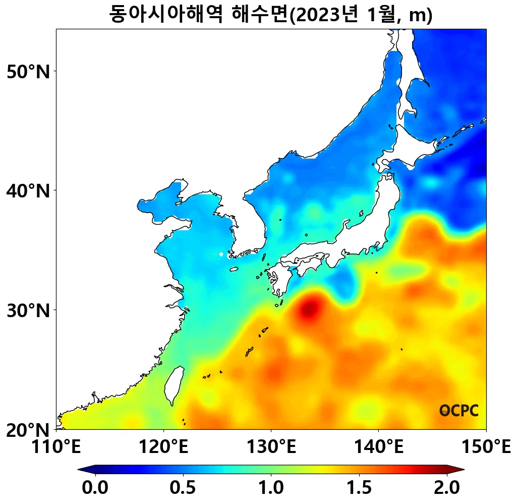 1993~2023년 동안 전지구 평균 1월 해수면은 10년에 3.5cm씩 상승하는 추세입니다. 동아시아해역은 10년에 3.5~3.8cm씩 상승하는 추세이며, 그 중 동해의 상승률이 가장 큽니다.