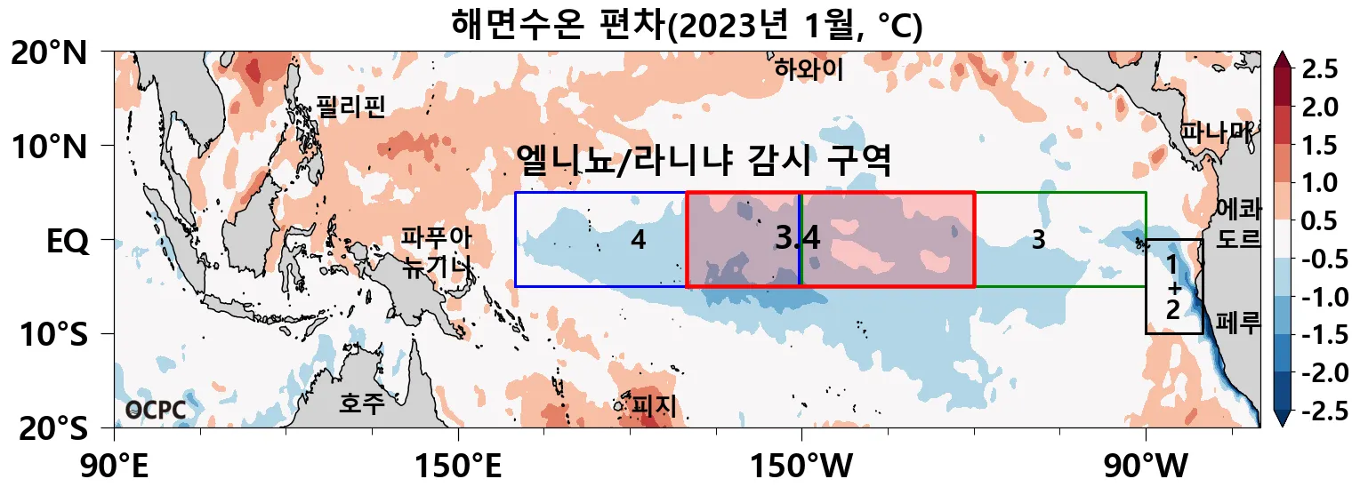 2023년 1월 평균 해면수온의 평년 대비 편차 (숫자가 표시된 사각형은 엘니뇨/라니냐 감시구역으로 각각 Nino1+2, Nino3, Nino4, Nino3.4 해역이며, ONI 지수는 Nino3.4 구역을 기준으로 합니다.)