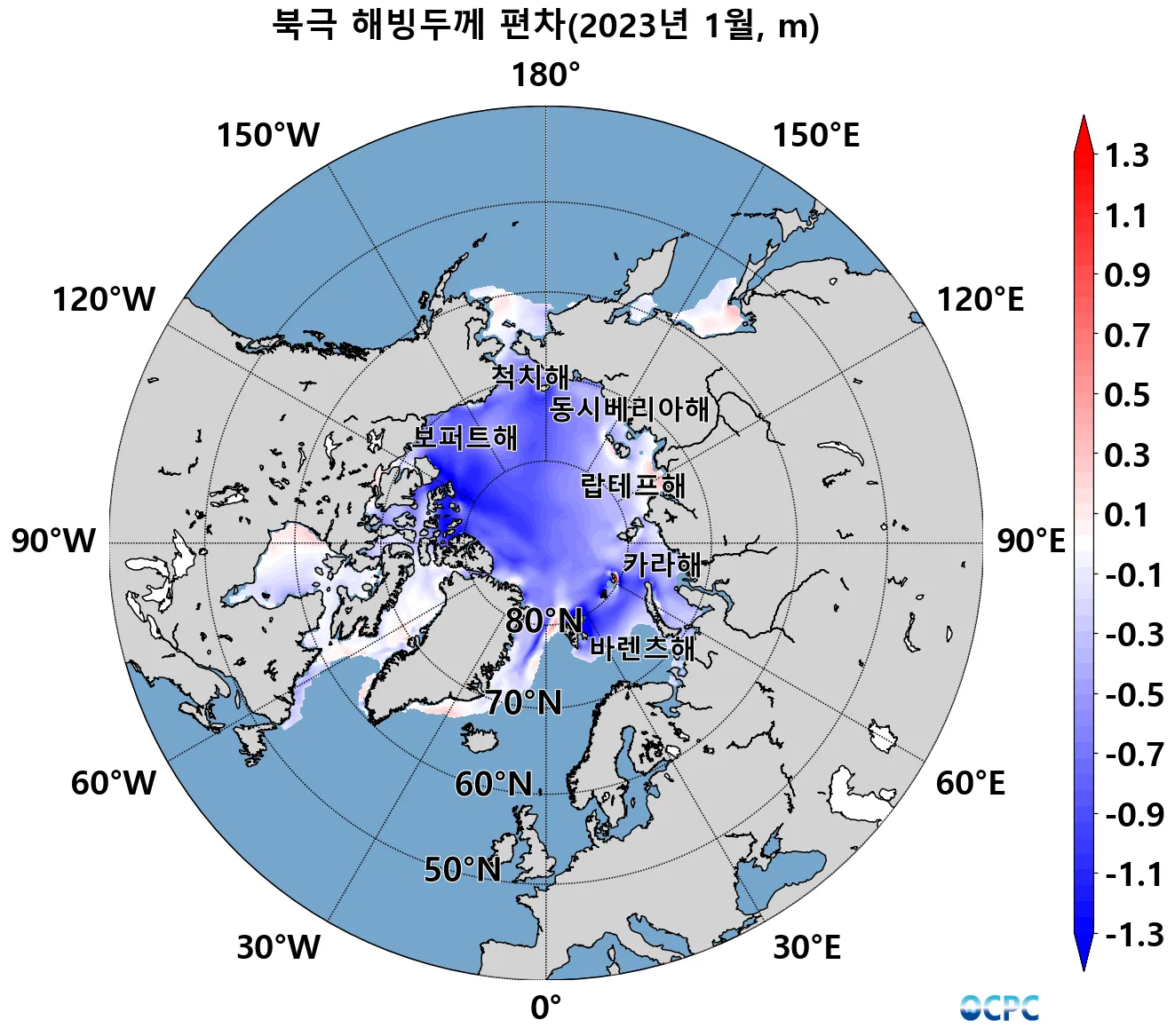 해빙두께 편차(당월·평년 해빙두께 0.15m 미만 해역 제외)