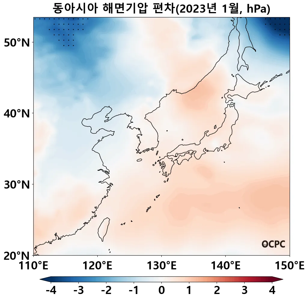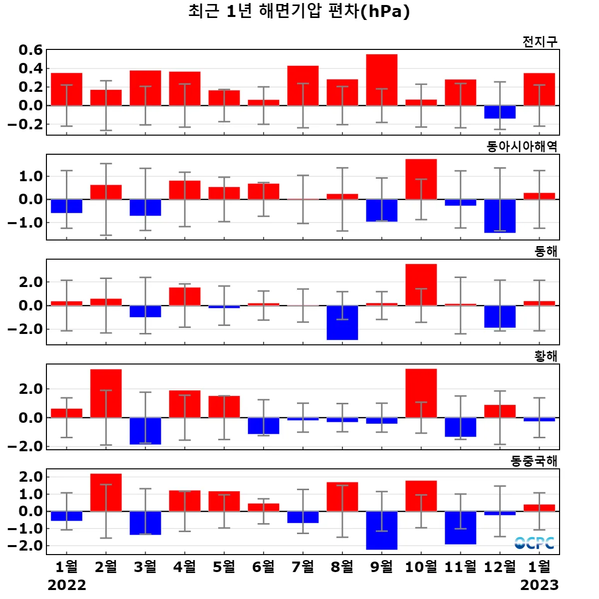 동해, 황해, 동중국해의 해면기압은 평년(1018.1±2.1hPa, 1026.3±1.4hPa, 1022.8±1.1hPa)과 비슷했습니다.