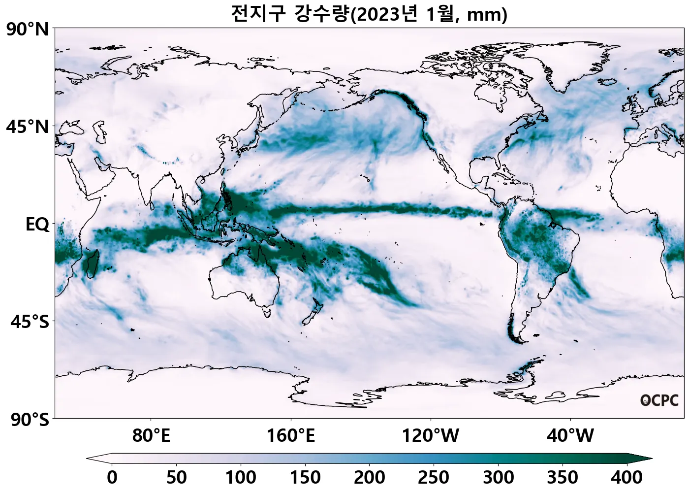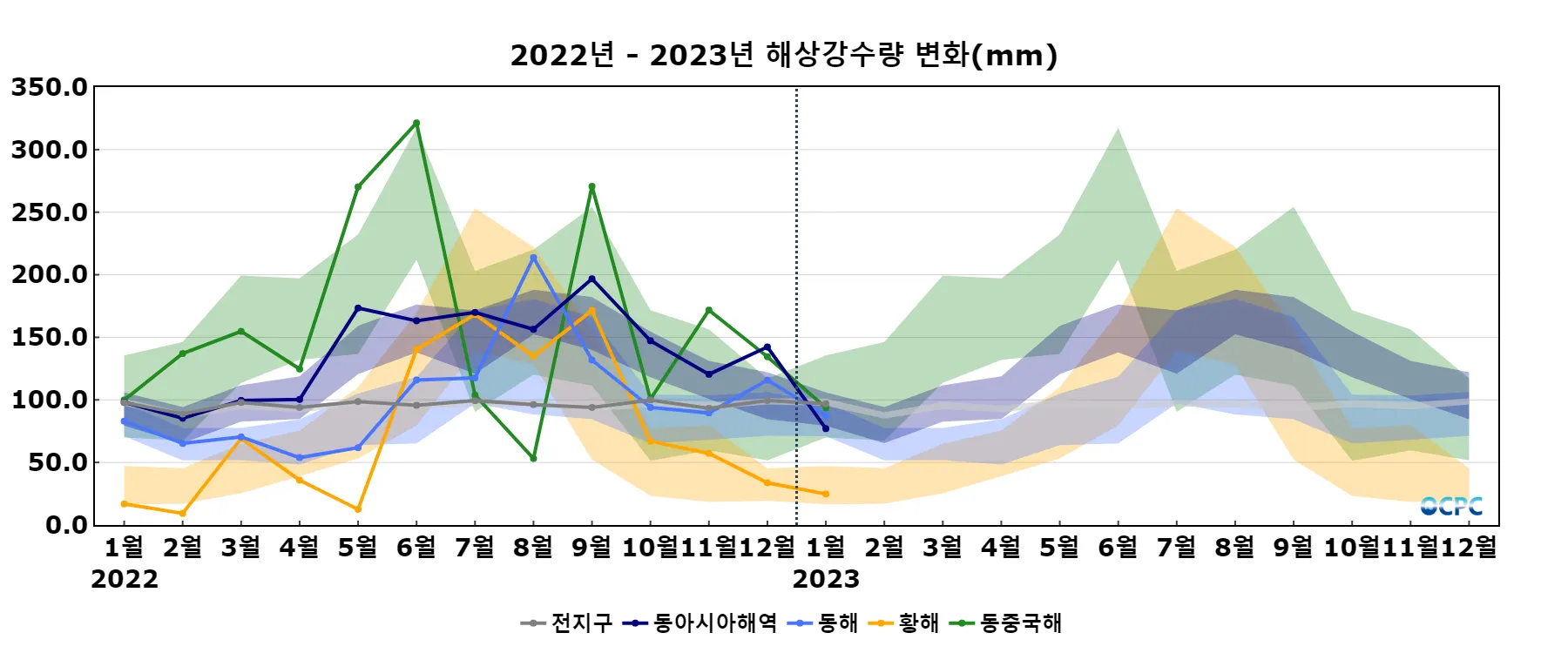 1993~2023년 동안 전지구 평균 1월 해상강수량은 10년에 1.6mm씩 증가하는 추세이며, 동아시아해역은 10년에 1.0mm씩 감소하는 추세입니다.