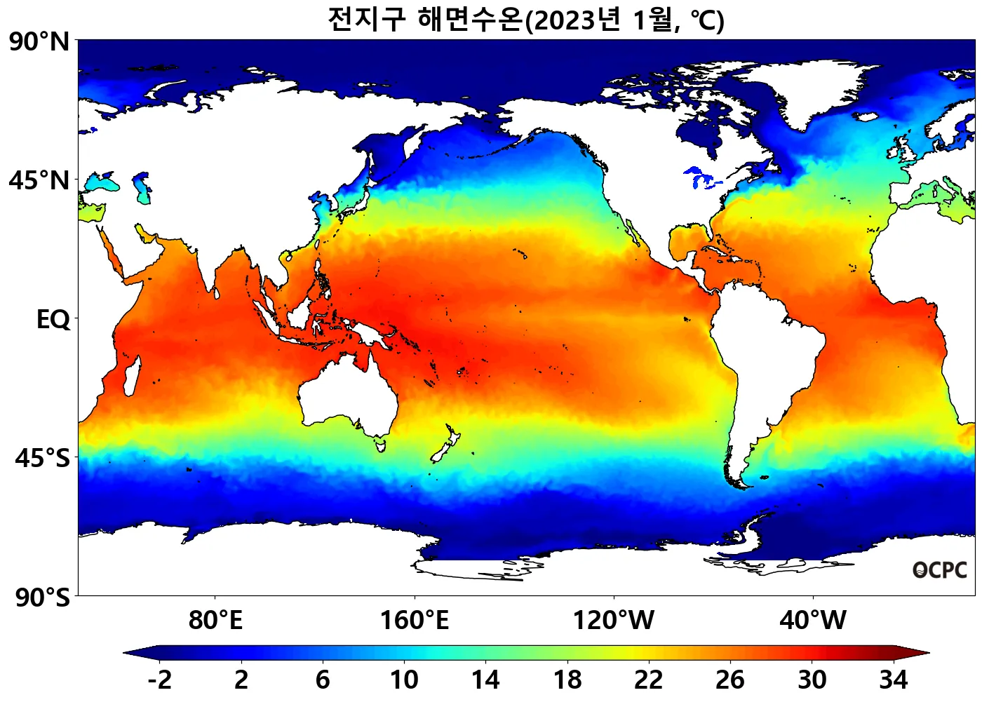 특히 북태평양 중위도 해역과 남대서양(30°S~60°S)의 해면수온이 높았으며, 열대 태평양(0~30°S)은 낮았습니다.