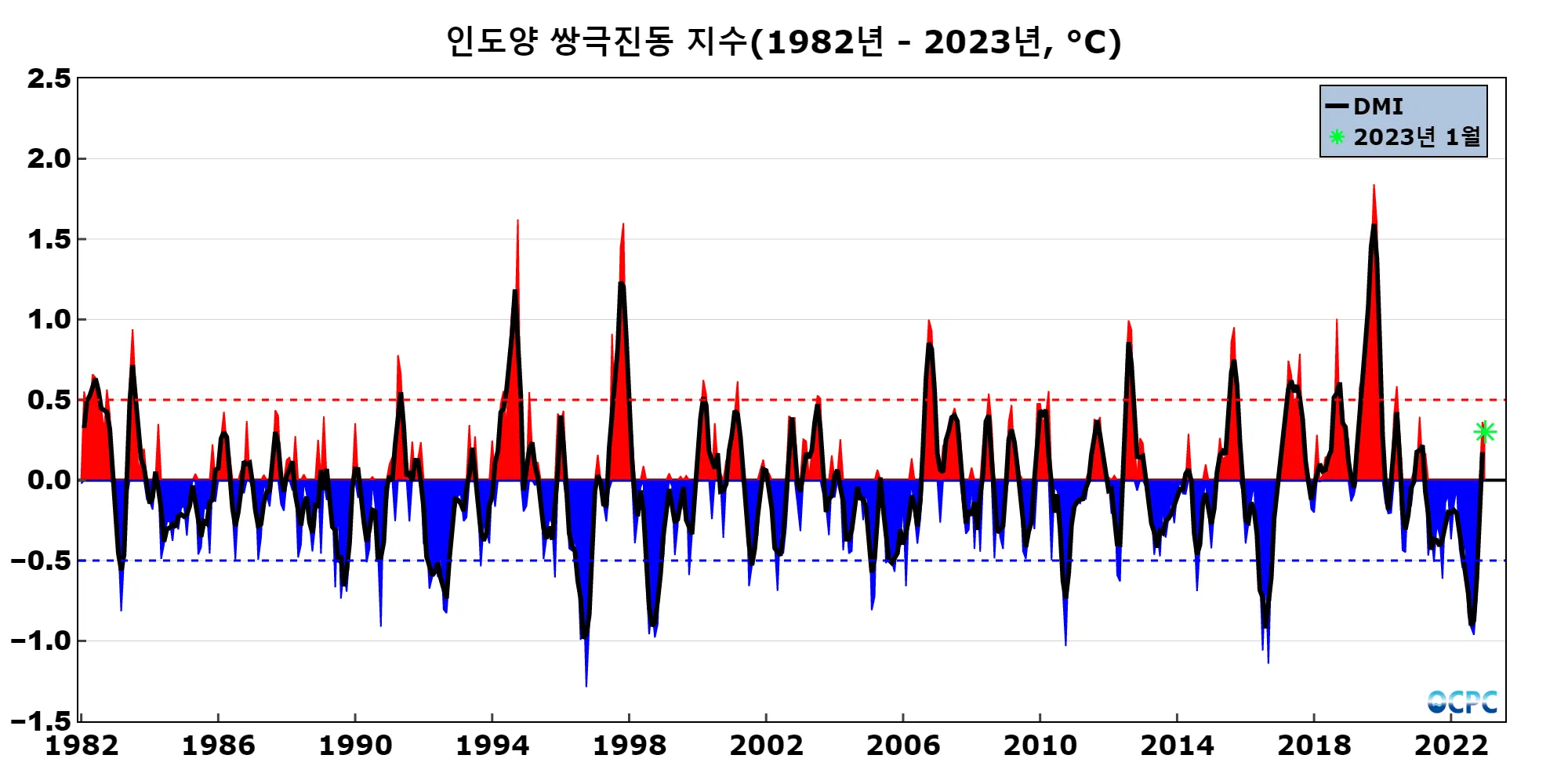 인도양 쌍극진동 지수 DMI (Dipole Mode Index)는 WTIO의 평년 대비 편차에서 SETIO의 평년 대비 편차를 뺀 값으로 월 평균 지수(채색부분)를 3개월 이동평균하여 나타낸 지수(검정선)가 0.5보다 크면 양의 상태로, -0.5보다 작으면 음의 상태로 판정합니다. OCPC 월간 분석정보에서는 당월 평균 지수만을 이용해서 잠정적으로 판정합니다.