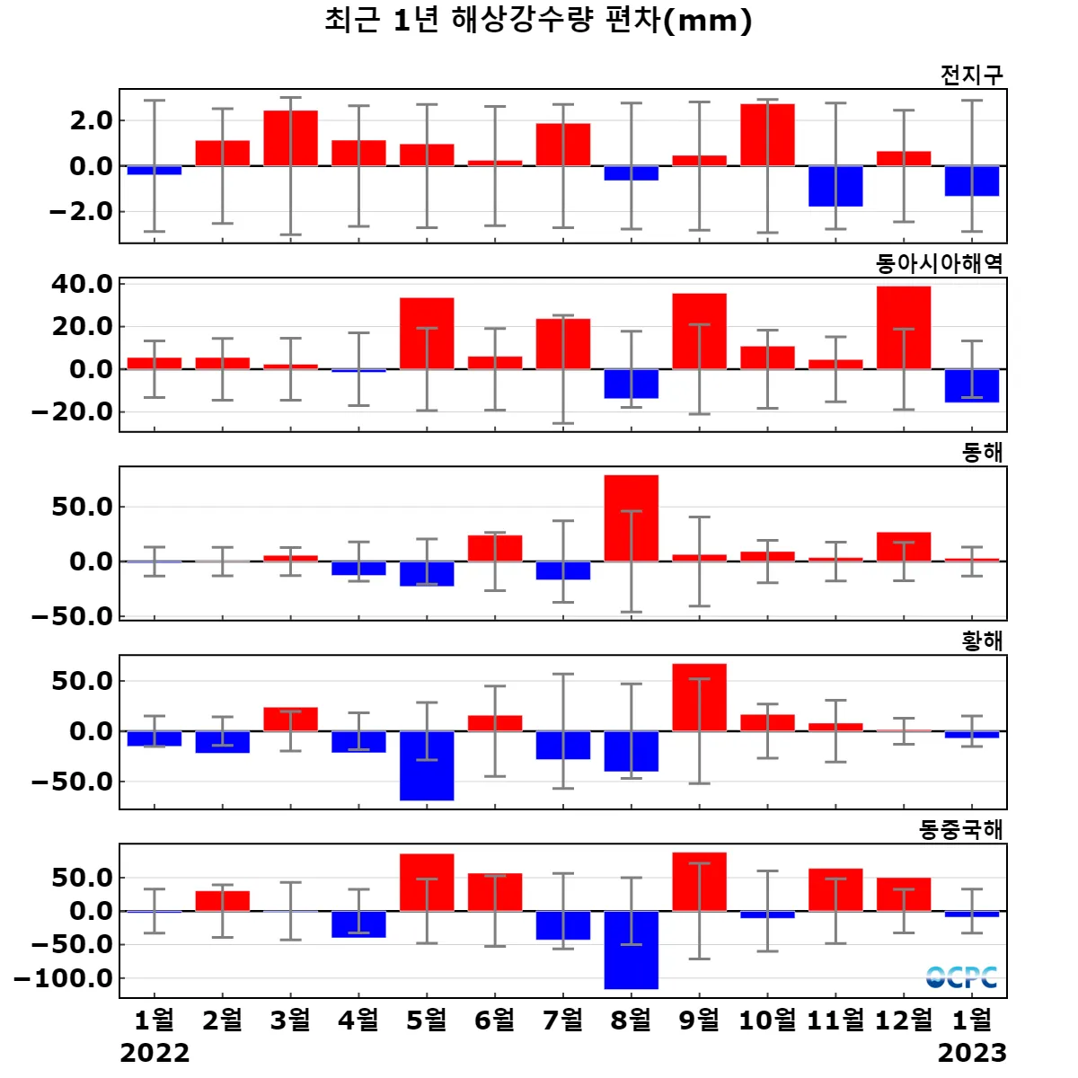동해, 황해, 동중국해의 해상강수량은 평년(84.2±13.3mm, 31.8±15.3mm, 102.7±32.8mm)과 비슷했습니다.