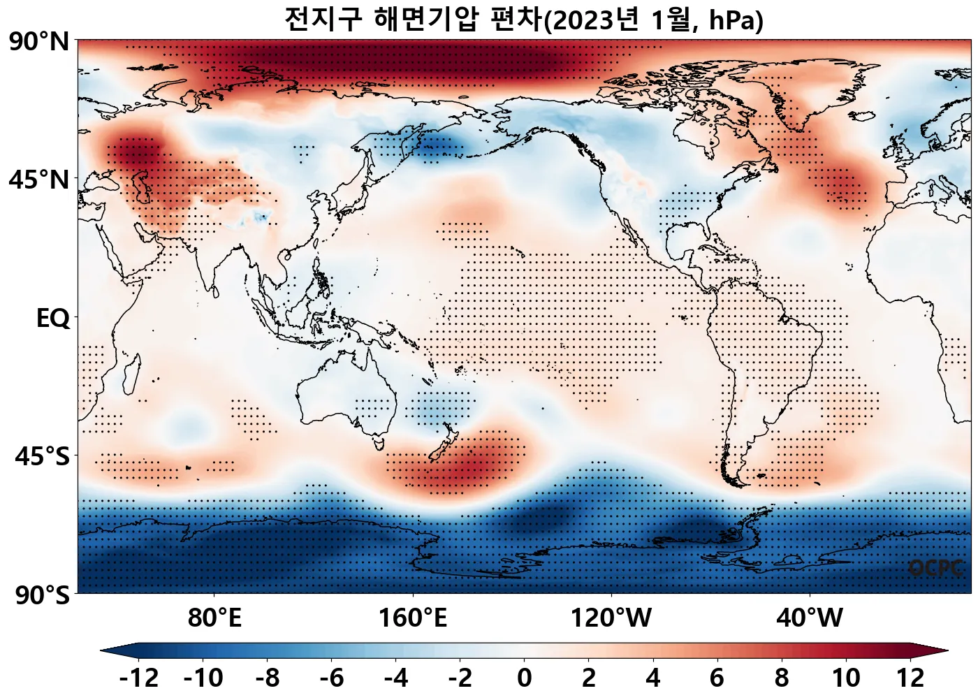 북극해의 해면기압은 평년보다 높았으며, 남극해는 평년보다 낮았습니다.