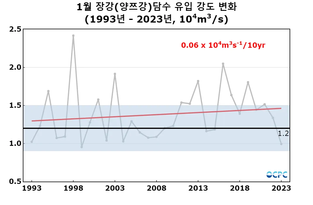 1993~2023년 동안 1월 장강 담수 유입 강도는 10년에 초당 600톤(한 달 동안 유입된 담수량으로 환산하면 10년에 1.6기가톤)씩 증가하는 추세입니다.