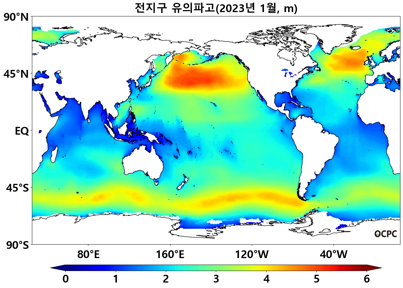 1993~2023년 동안 전지구, 동아시아해역의 1월 평균 유의파고는 10년에 0.2~0.3cm씩 증가하는 추세입니다.