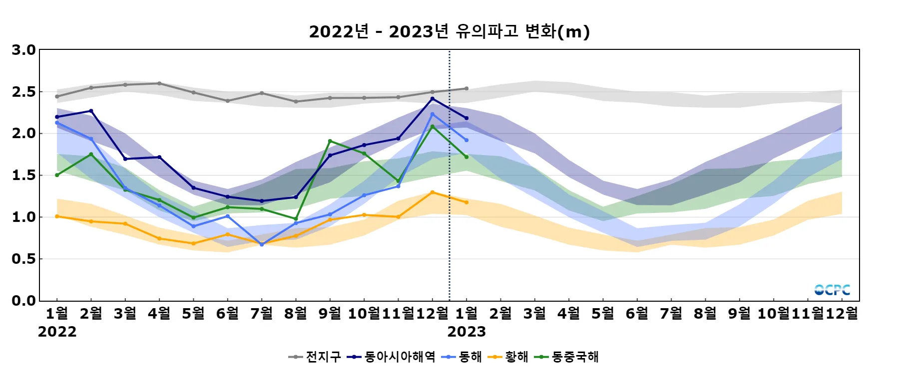 동해, 황해, 동중국해의 평균 유의파고는 평년(2.0±0.2m, 1.1±0.1m, 1.7±0.1m)과 비슷했습니다.