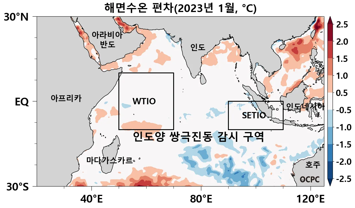 2023년 1월 평균 해면수온의 평년 대비 편차 (사각형은 인도양 쌍극진동 감시구역으로 각각 WTIO(열대서인도양), SETIO(열대 남동인도양) 해역이며, 인도양 쌍극진동 지수(DMI: Dipole Mode Index)는 WTIO의 평년 대비 편차에서 SETIO의 평년 대비 편차를 뺀 값입니다.)