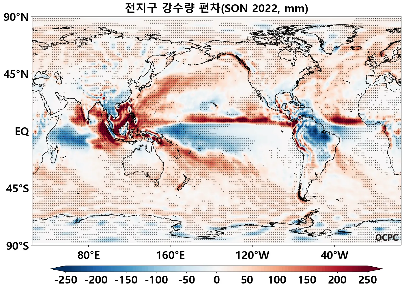 A-B. 전지구 강수량 편차 전망(2022년 9~11월 평균, 점표시: 평년 표준편차 초과 해역)
