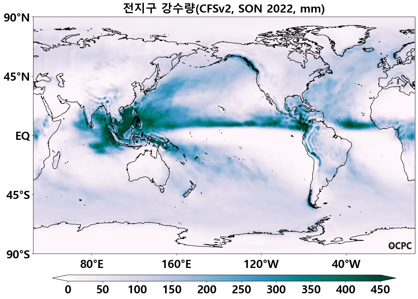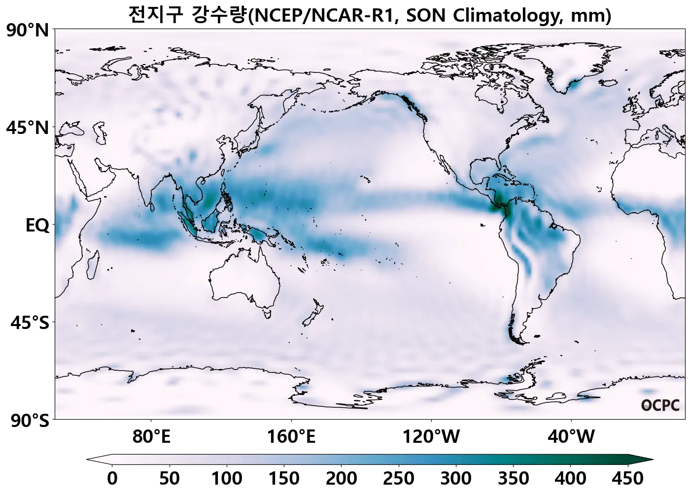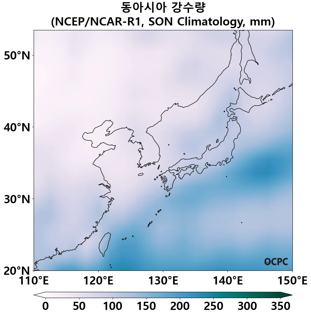 전지구 및 동아시아해역 9~11월 평균 해상강수량은 평년보다 많겠습니다.