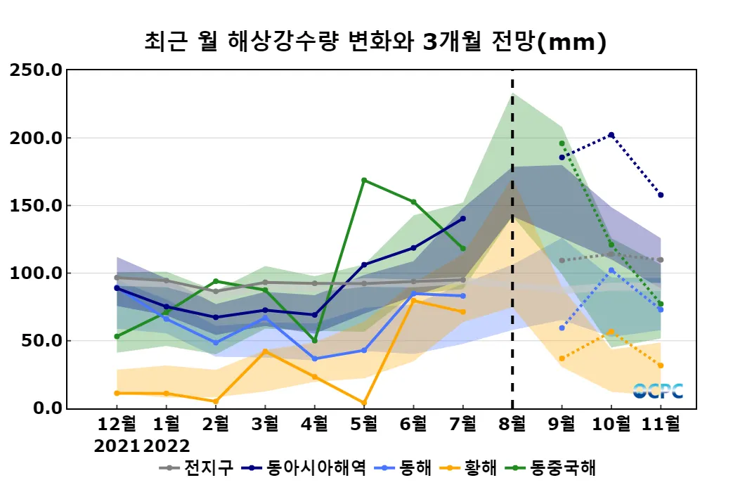3개월(9,10,11월) 평균 전망: 동해, 황해, 동중국해의 해면수온은 평년보다 높고, 열대 태평양에서는 라니냐가 지속될 것으로 전망됩니다.