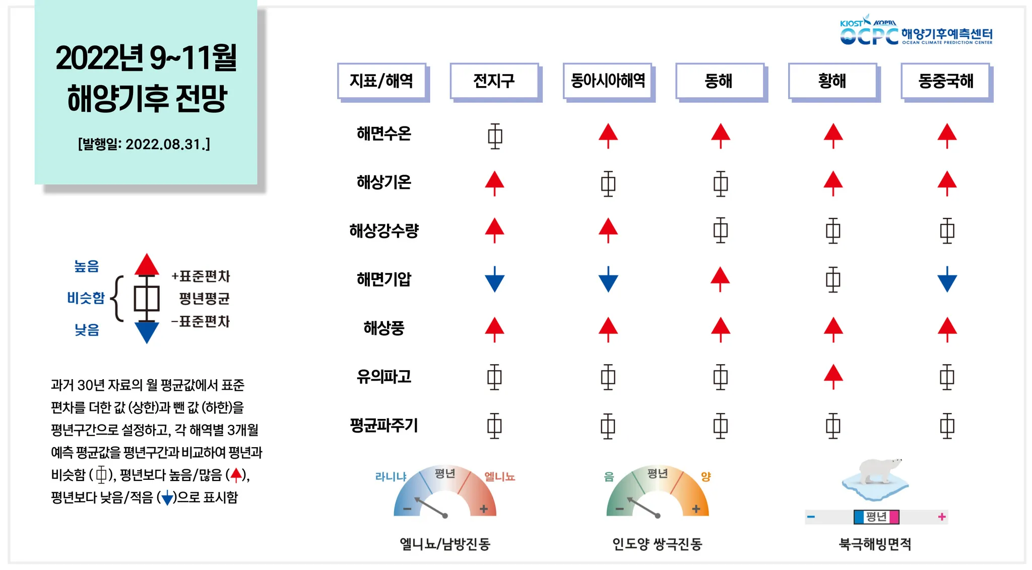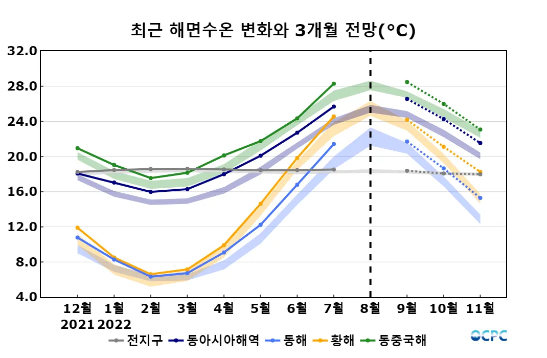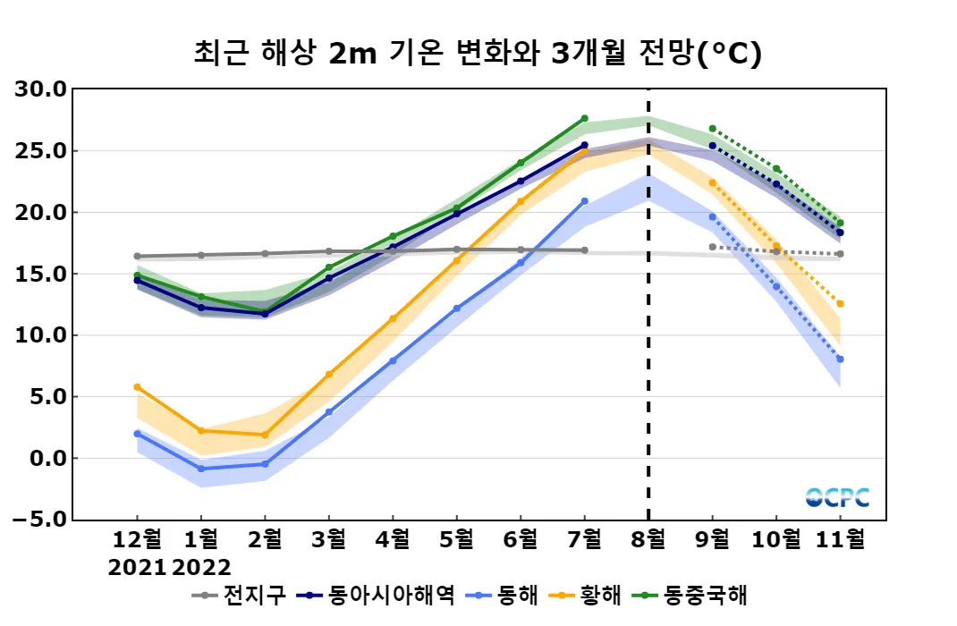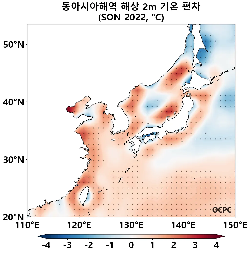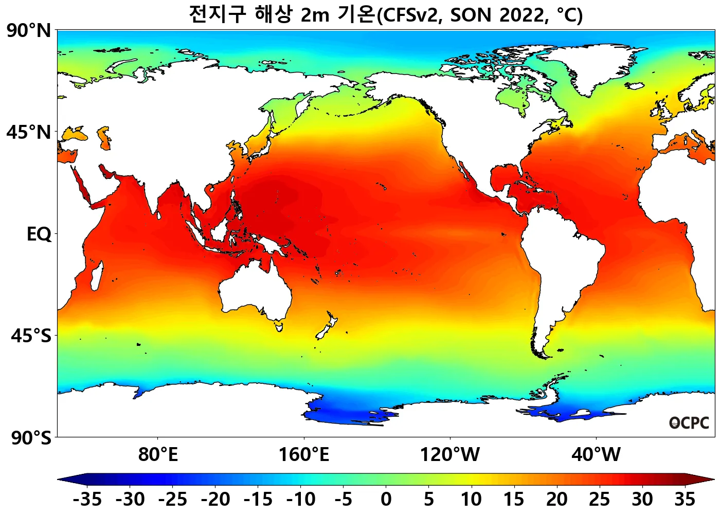 전지구 평균 해상기온은 평년보다 높겠으며, 동아시아해역은 평년과 비슷하겠습니다.
