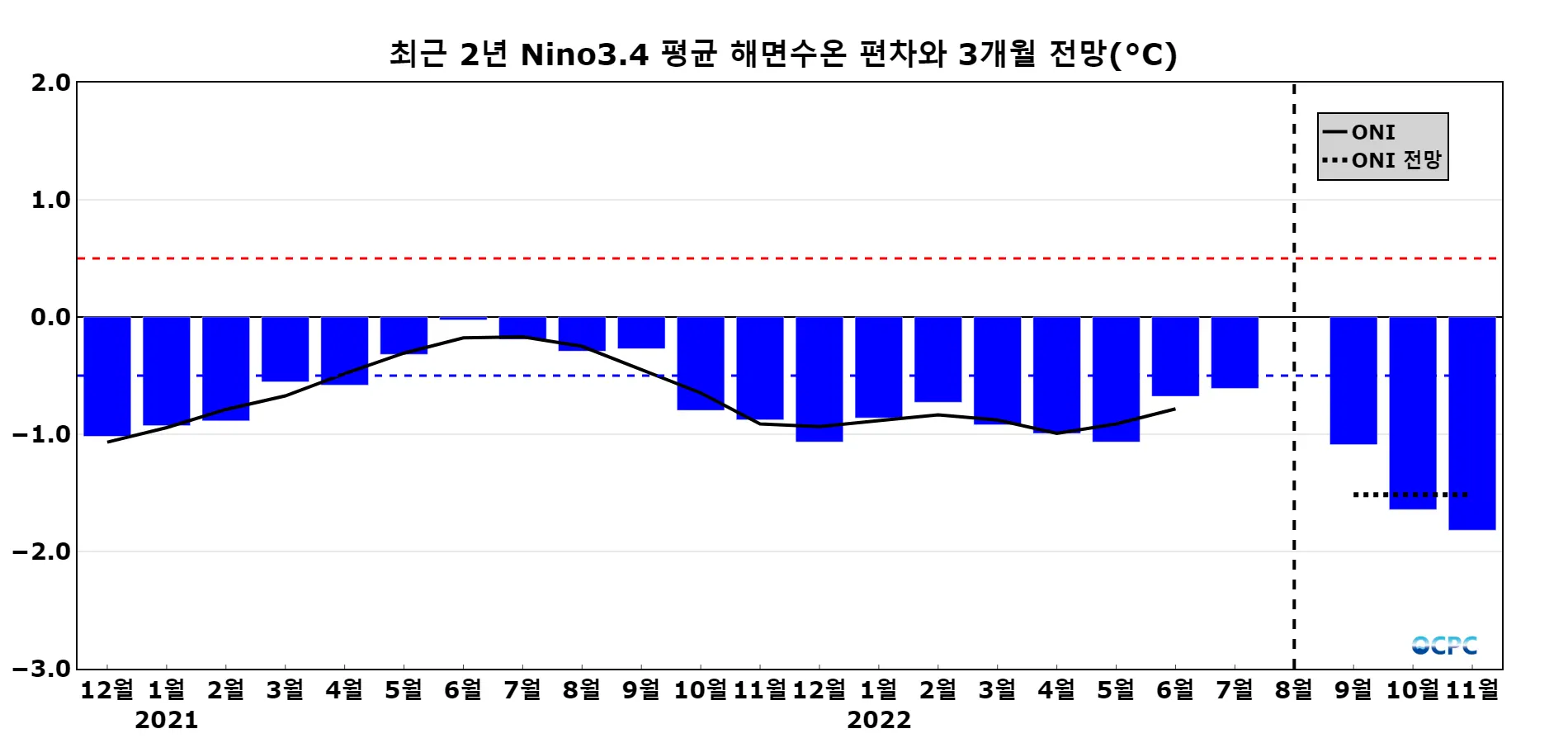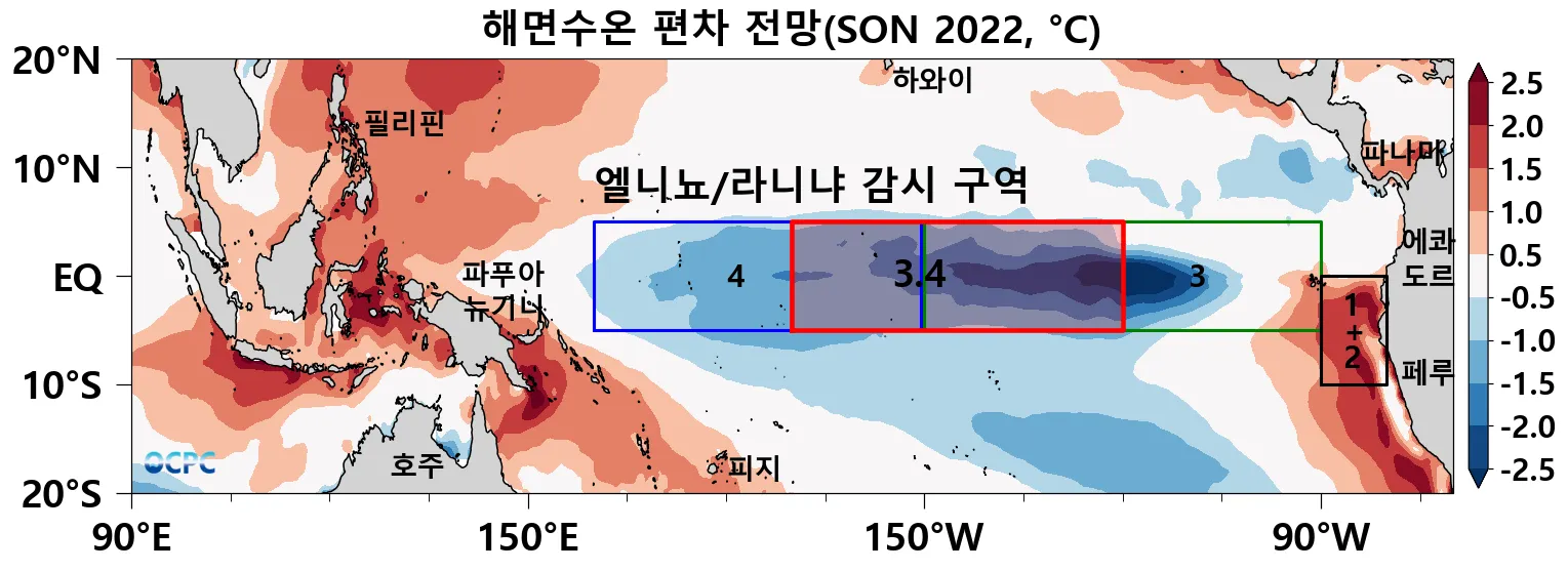 엘니뇨/라니냐 감시구역인 Nino3.4 해역(5°S~5°N, 170°W~120°W)의 9~11월(SON) 해면수온 편차는 라니냐 상태가 지속될 것으로 전망됩니다.